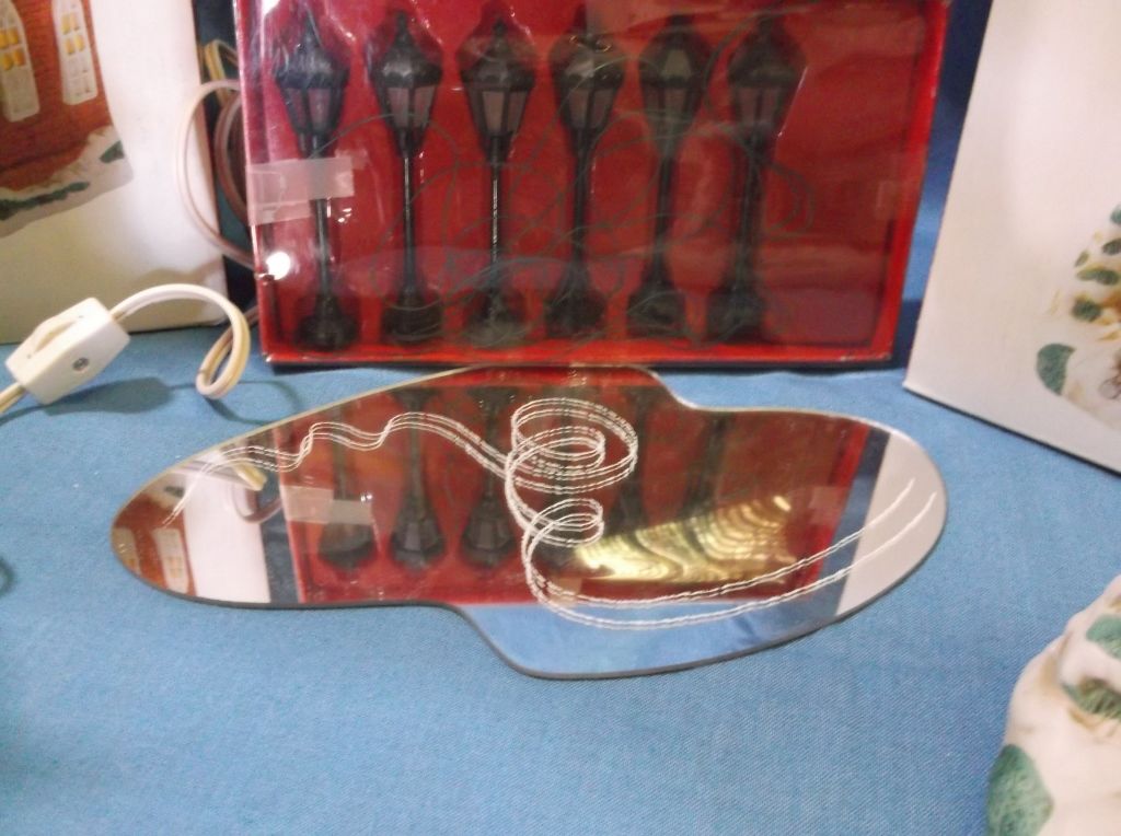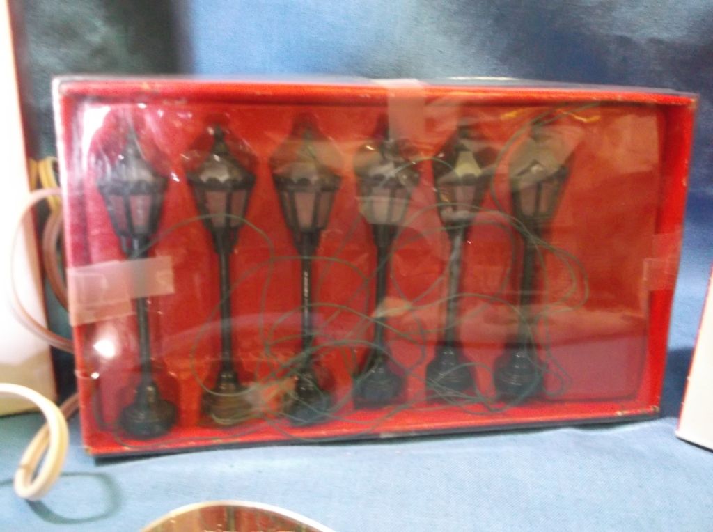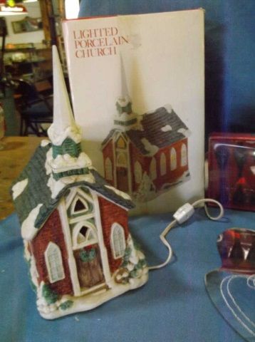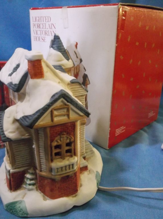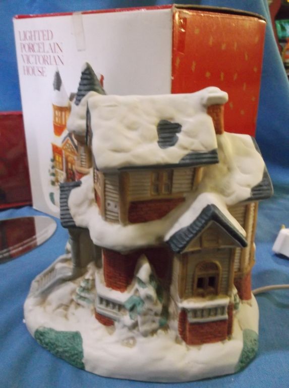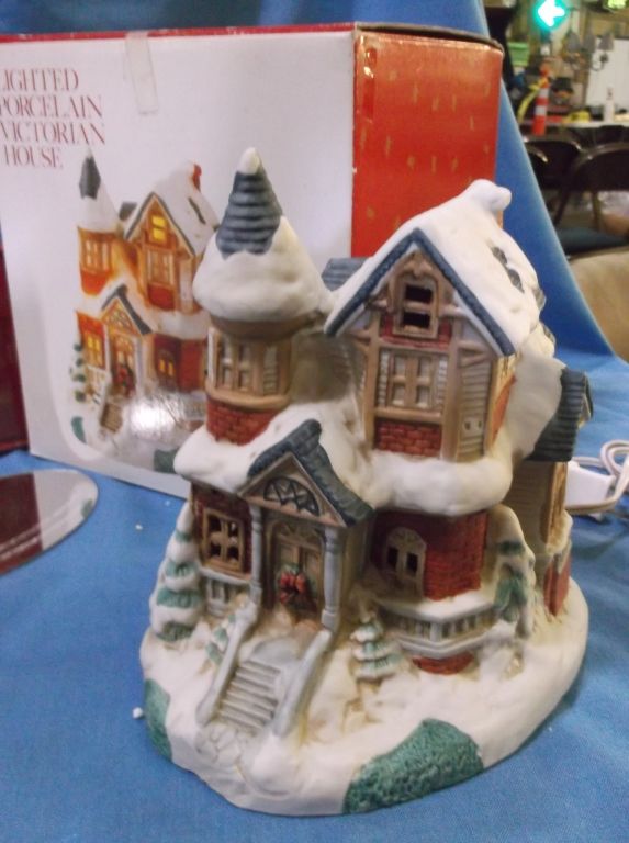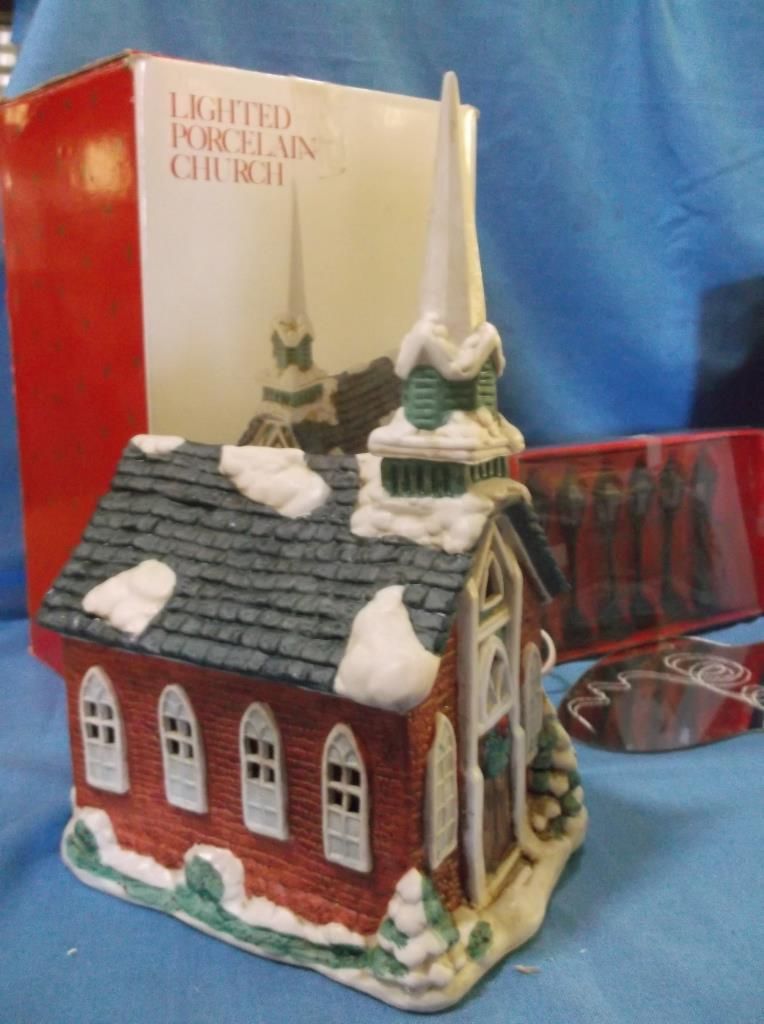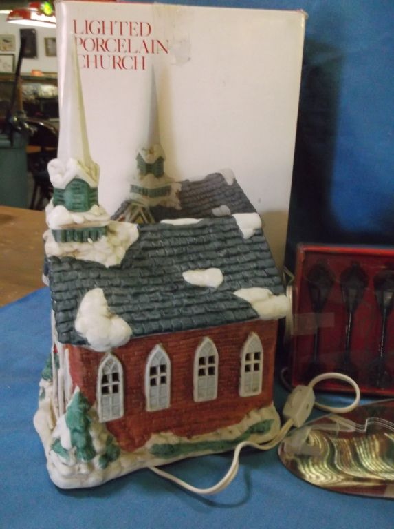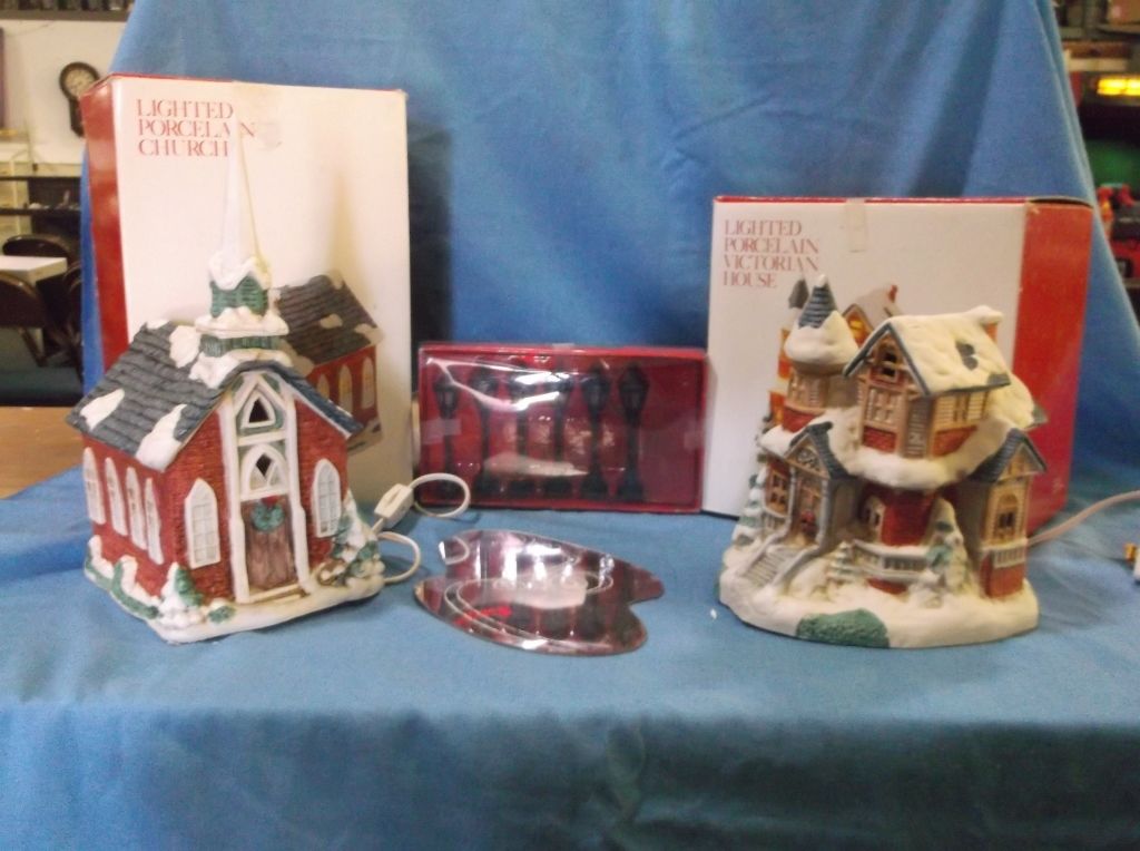 1- Hand painted church approx 6" x 12" lighted, 1- Victorian House approx 6" x 9" lighted all in box..... 1 set of 6 Street Lanterns new in box.... approx 4" tall