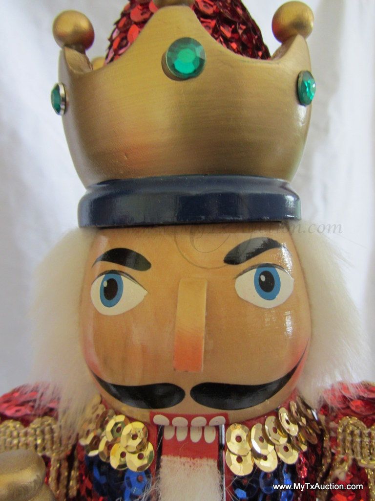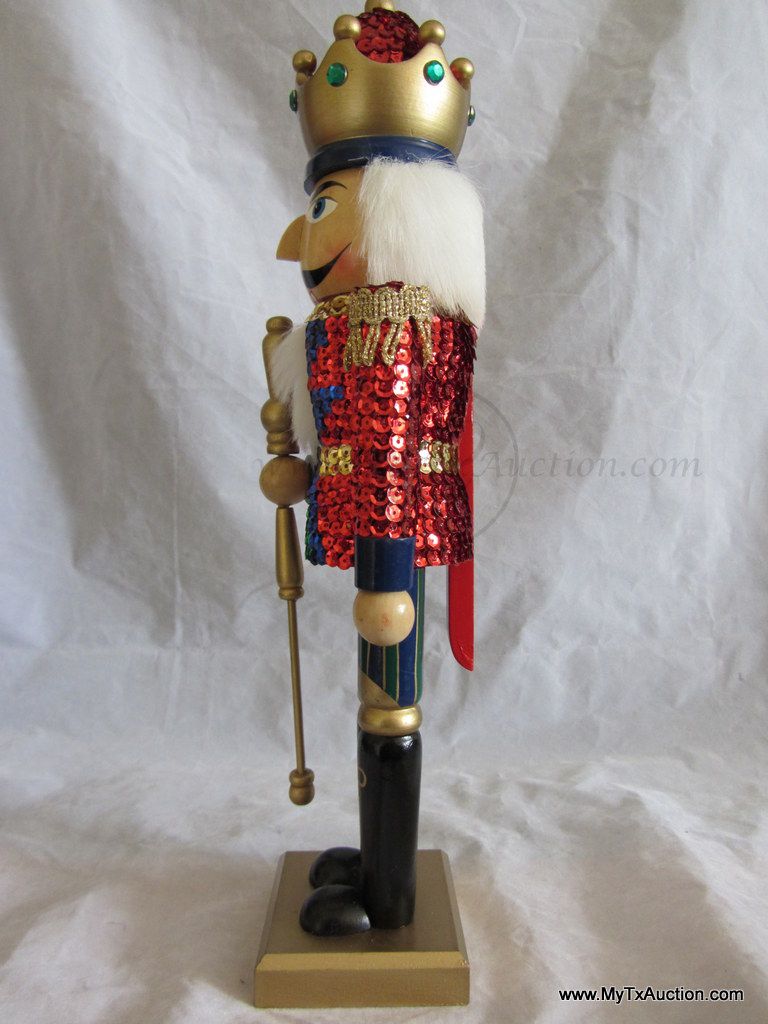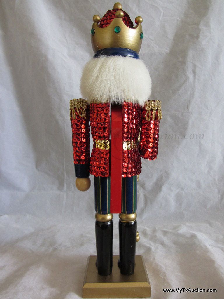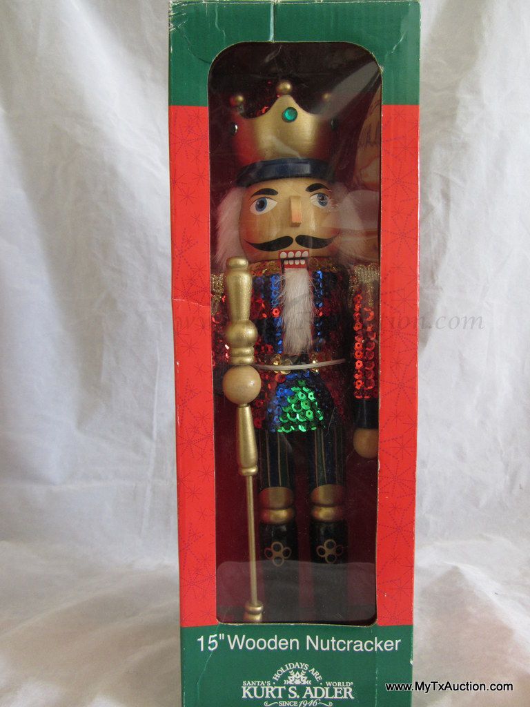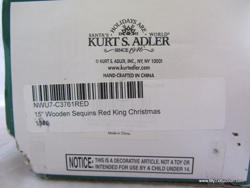 Kurt S. Adler Holidays are Santa's World Collection Nutcracker presents this 15" Wooden Sequins Red King Christmas nutcracker in original box NOTE: box has damage (See images for details)
