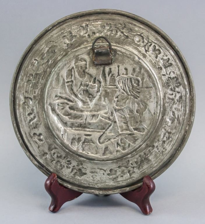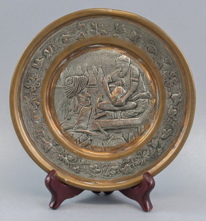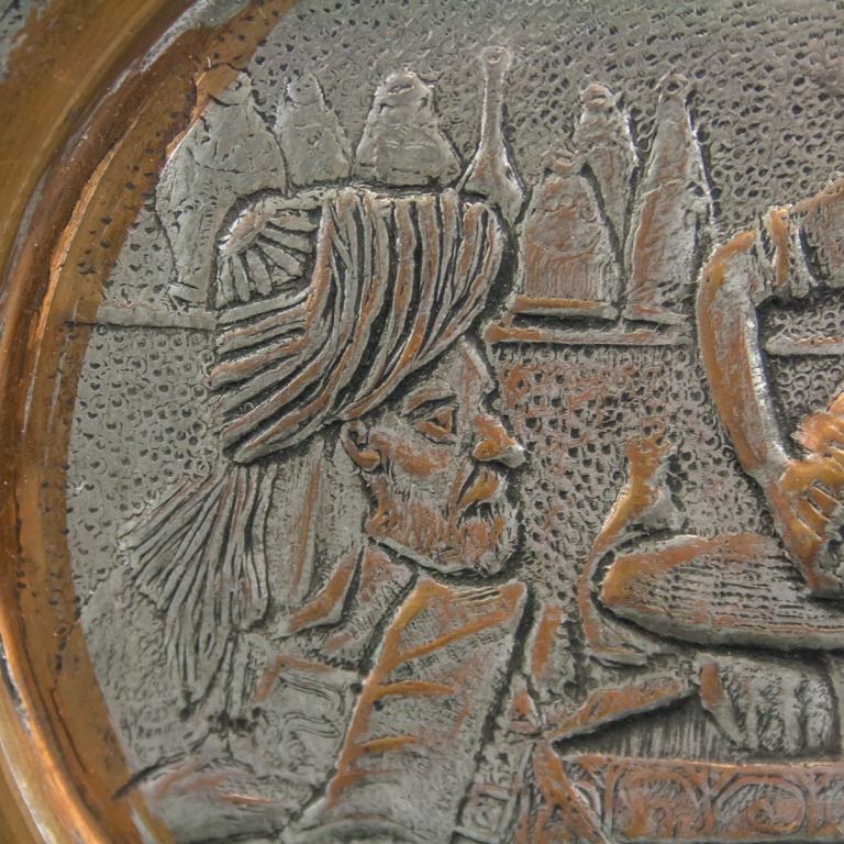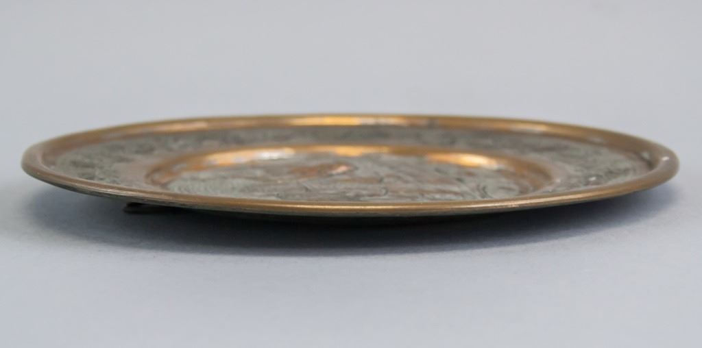 Copper and silver carved plate. Featuring two figures with floral pattern around the outside. Diameter: 16 cm. Height: 2 cm. 126 grams.