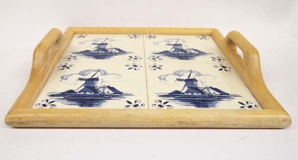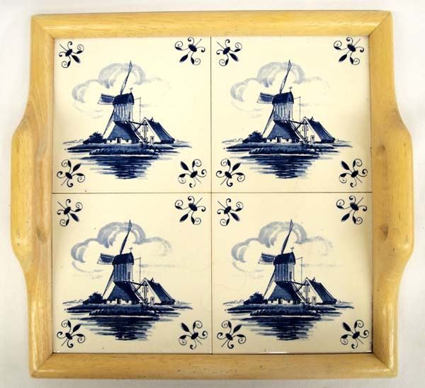 Holland Delft Tile and Oak Wood Tray, measures 13.5'' square, tiles measures 6'' square