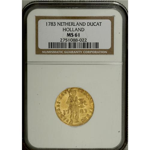 <B>Holland. Gold Ducat 1783,</B></I> F-250, KM12, MS61 NGC. Lustrous with a slightly wavy flan and numerous contact marks.<BR><BR><b>Shipping:</b> Coin/Currency (<a target="_blank" href="http://www.heritageauctions.com/common/shipping.php">view shipping information</a>)