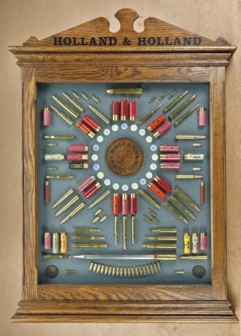 Holland & Holland cartridge display board measuring 34-1/4” in height by 25-1/4” wide. Shows shotgun and big game cartridges and specialty cartridges. The case shows some scratches, mars and dings, all cartridges present, generally good overall. From the Robert Petersen Collection. Est: $2,000 - $4,000