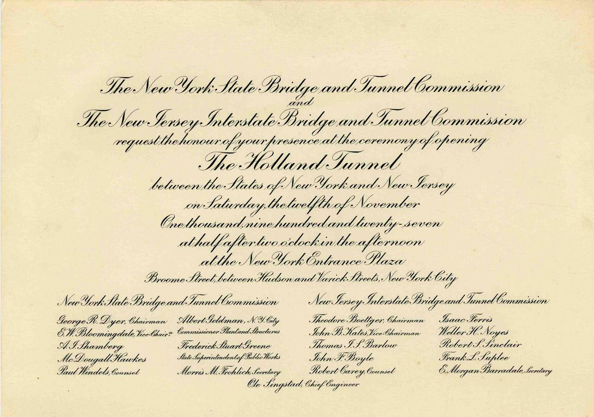 Holland Tunnel opening ceremony invitation dated 12 November 1927, and tunnel entrance ticket, dated 18 November 1927. Invitation commemorates the opening of the tunnel connecting New York and New Jersey and lists names of Bridge and Tunnel Commission members, including Chief Engineer Ole Singstad, who completed the tunnel after Clifford Holland died before its final completion. Invitation measures 9'' x 6.5'' and is in near fine condition. Ticket, measuring 3.5'' x 3.5'', cost 50 cents at time of purchase and is in very good condition.