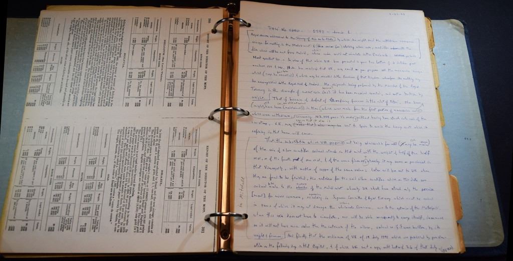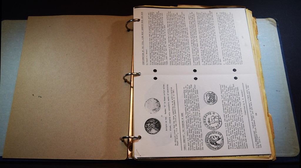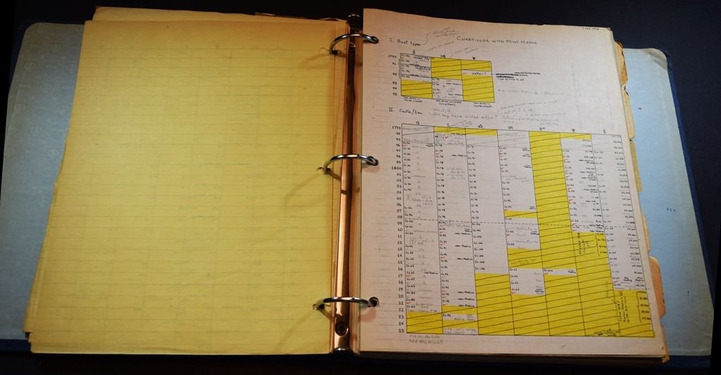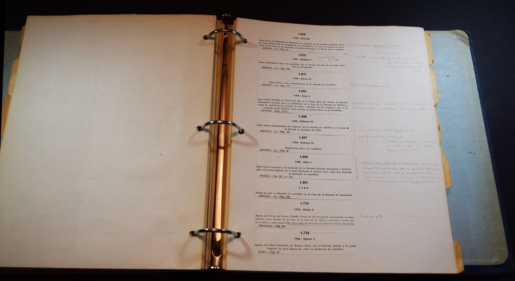 Wallace, Holland. HOLLAND WALLACE'S COLLECTED RESEARCH AND PERSONAL NOTES ON 1/4 REALES (CUARTILLOS) DIE VARIETIES. This lot consists of Holland Wallace's personal research and notes that he gathered on the subject of Latin American quarter reales die varieties. The research is collected in a blue cloth covered boards, three-ring binder titled '1/4 Real' and organized by manila tabbed dividers. This research collection contains dated hand written personal notes or data tables on lined notebook paper, copies of type-written signed letters from fellow researchers and colleagues, hand-written annotations on xeroxed copies of articles, annotated compilations of cut-out articles from numismatic journals, dated hand written personal notes or data tables on the backs of xeroxed copies of articles or chapters from books, and hand-written translations of copies of type-written articles. This piece of research is organized according to the following sections: Medina 1 (Chilenas 1902); Medina 2 (Coloniales 1919); Burzio 1 (Potosi 1943); Dasi (1951); Prober; Burzio 2 (Diccionario '53); Mitchell (1963); Muñoz - Pradeau 2 (1967-68); Barriga (1969); and Cunietti, Ferrando (1971). Lot weight: 3 lbs 10oz. Subject(s): Coinage - Latin America.