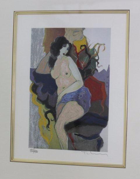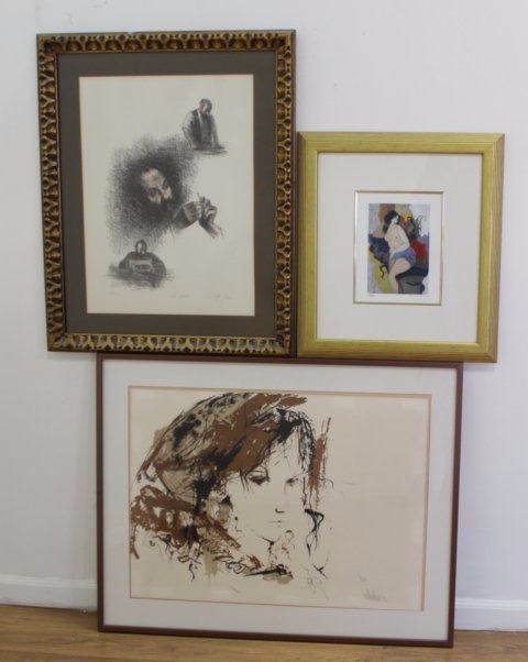 Gino Hollander, "Siri" - lithograph, pencil signed and dated 1978 lower right A/P, Arches paper, with paperwork from Circle Gallery, approx. 22" H x 30" W sight, 28" H x 36" W framed. Isaac Tarkay, "Young Lady," signed, numbered 172/400, approx. 10" H x 8" W sight, 21 1/2" H x 19 1/2" W framed. Tully Filmus, "The Tailor," pencil signed and numbered 43/225, approx. 23" H x 17" W sight, 31" H x 25" W framed.