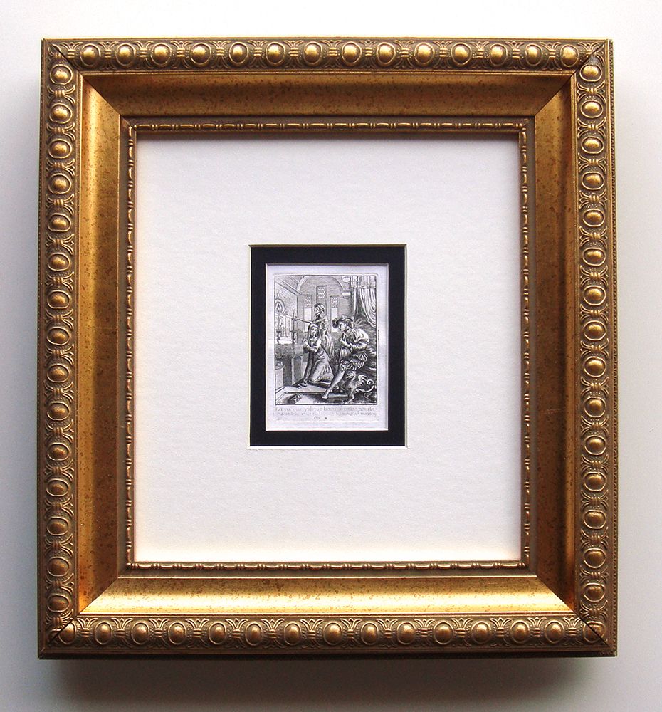 Holbein, Hans by Wenceslaus Hollar. "Dance of Death - Plate: 16 The Nun " from the original designs of Hans Holbein. Engraving on wove paper. 1804. From the original plates created by Hollar. This is not a modern print. The strike is crisp and the lines are sharp. (Plate Size c. 2 1/8 x 2 7/8 inches). Comes with a Certificate of Authenticity. Notes: Dance of Death, also variously called Danse Macabre (French), Danza Macabra (Italian), Dansul Morţii (Romanian), Danza de la Muerte (Spanish), Dansa de la Mort (Catalan), Dansa Macabra (Portuguese language), Totentanz (German), Dodendans (Dutch), Surmatants (Estonian), is an artistic genre of late-medieval allegory on the universality of death: no matter one's station in life, the Dance of Death unites all. The Danse Macabre consists of the dead or personified Death summoning representatives from all walks of life to dance along to the grave, typically with a pope, emperor, king, child, and labourer. They were produced to remind people of the fragility of their lives and how vain were the glories of earthly life. Its origins are postulated from illustrated sermon texts; the earliest recorded visual scheme was a now lost mural in the Saints Innocents Cemetery in Paris dating from 1424-25. This work is double matted and framed in a solid wood moulding. The frame is new. Dimensions: c. 12 x 13 inches.