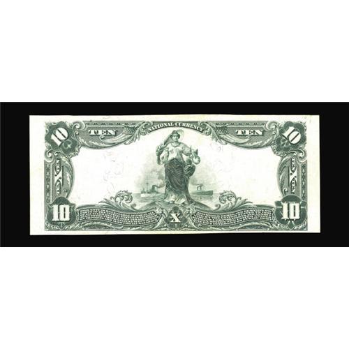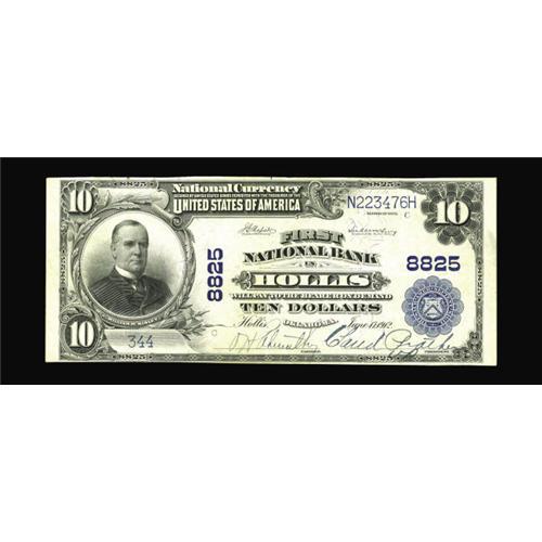 <B>Hollis, OK</B></I> - $10 1902 Plain Back Fr. 628 <B>First NB</B></I> Ch. # 8825<BR>This just plain rare bank used more titles during its 22 year run (3) than the combined census for all of its notes put together (2). This is the only note listed from here in the census with a grade, the other is listed without a grade and is an item we have never seen. Neither piece has ever been offered at public sale prior to tonight's appearance. Fortunately for collectors, this is a simply gorgeous item, with bright white paper, vivid inks, and sharp pen signatures. <B>Very Fine,</B></I> a real peach of a note destined for a serious collection of Oklahoma Nationals.