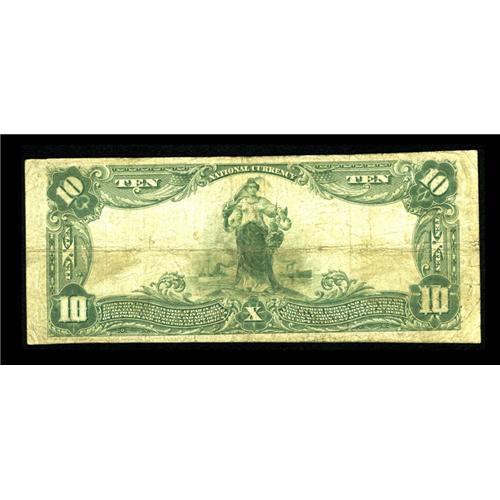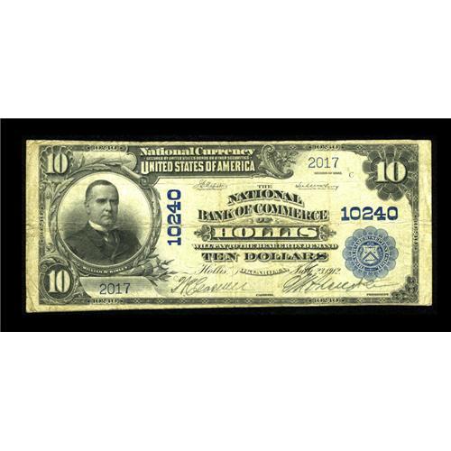 <B>Hollis, OK</B></I> - $10 1902 Plain Back Fr. 628 <B>The NB of Commerce</B></I> Ch. # 10240<BR>Four large size notes are known from this bank, which had a meager $330 outstanding in large at the bank's closing in 1935. Through the vagaries of fate, and our good fortune in selling two major Oklahoma collections within the past year, we have now had the pleasure of offering three of the four reported examples. Once this piece is gone, don't expect many more opportunities to obtain a large note from here in the foreseeable future. Pen signed <B>Fine.</B></I><BR><I>From The Rolling Plains Collection</B></I><BR><BR><b>Shipping:</b> Coins & Currency (<a target="_blank" href="http://www.heritageauctions.com/common/shipping.php">view shipping information</a>)