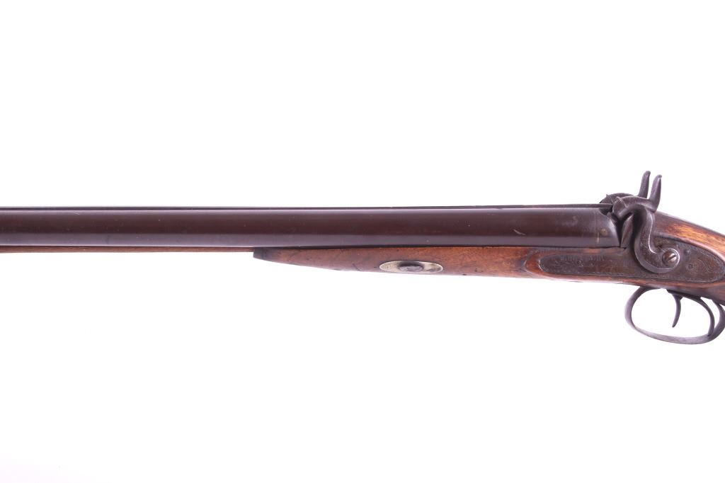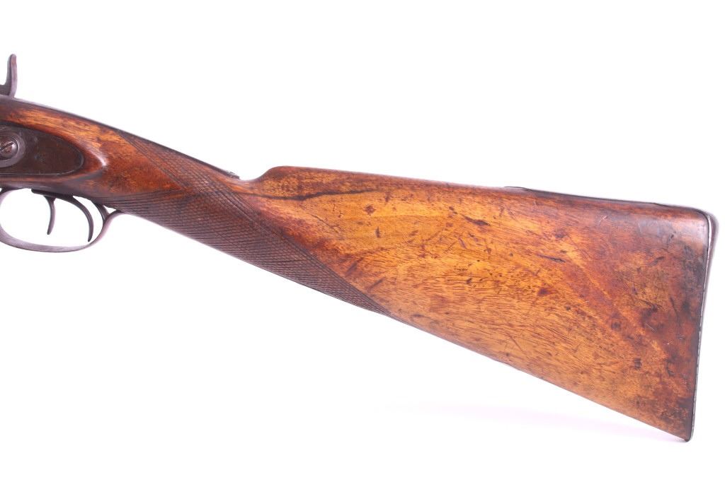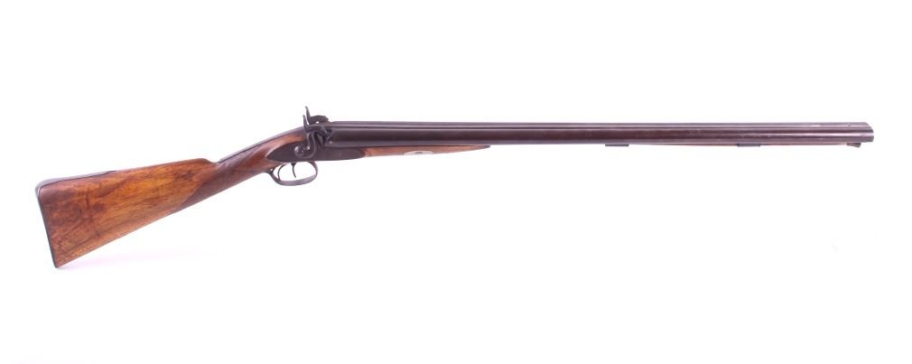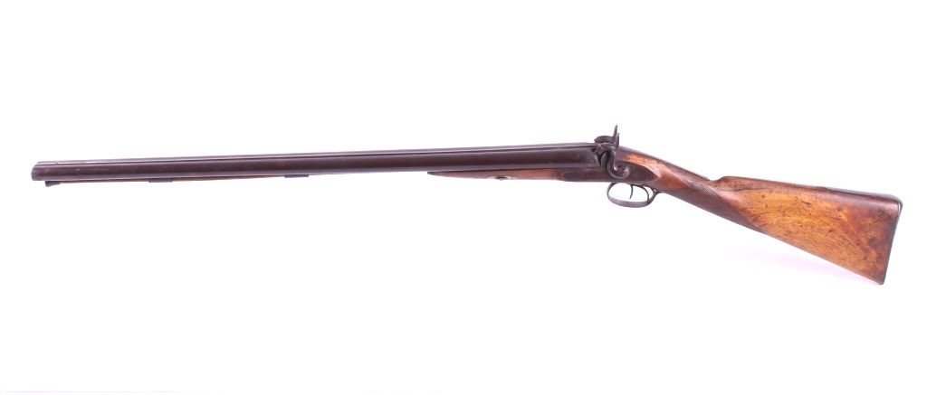 High Grade Hollis and Sheath 12 gauge double barrel percussion shotgun made for the American Civil War and Frontier market. Hollis and Sheath were well known and well established Birmingham, England Gunmakers. They made exceptionally high quality arms from 1852-1862. What is interesting about this fine example is that it was made not for the gentle shooting in England in which “beaters” ? typically marched through the woods on vast estates driving game and birds in front of stationary shooters. Shotguns intended for this type of sport shooting were built less robustly and lighter in weight. On this subject shotgun, the build was very robust and reinforced for harsh service. This is apparent by the heavy and long upper and lower tangs on the top and bottom of the wrist area of this shotgun. Extra long tangs, such as these, were used to support this normally vulnerable area of the stock from cracks and damage from rough handling especially on horseback. This feature is often seen on frontier muzzle loading plains rifles of the period. The engraved upper tang extends all the way back to the comb of the stock while the lower tang extends even further. Both lend great support to this area of the stock which was certainly effective as the stock is completely free of cracks or breaks in this area- which most arms of this type generally exhibit. It is a known historical fact that the double barrel percussion shotgun was used extensively by the Confederacy during the Civil War. This type of arm was also considered a staple on the pre and post Civil War Frontier of the West. It is remarkable to find such a shotgun in this fine state of preservation. During this time, there were virtually no American makers of fine double barrel percussion shotguns and the American arms trade depended upon shotguns imported from Europe. Many of these were inexpensive utilitarian shotguns from Belgium, while the best quality and most expensive shotguns came from well known makers in England. This fine side lock example is in particularly fine condition showing nice checkering on the wrist and fine scroll engraving on the lock plates, trigger guard, tangs, butt plate, hammers, rear of the barrels and smaller furniture. The barrel rib is marked “FINE LONDON TWIST” referring to the steel barrel material. The forward part of the barrel rib is further enhanced with silver inlays of a decorative pattern around the front sight bead. There is also a silver oval initial plate on the bottom of the butt stock. Fully functional, this example shows no polishing, restoration or alterations that would detract from its fine appearance or value. It is rare to find an arm made for the American market of the 1850s to early Civil War period in this fine and undamaged state. This shotgun exudes both grace and history. The firearm qualifies as an Antique shotgun and does not require FFL Transfer or NICS Background Check.
