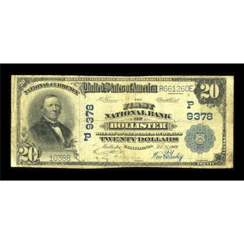 <B>Hollister, CA</B></I> - $20 1902 Plain Back Fr. 652 <B>The First NB</B></I> Ch. # (P)9378<BR> An evenly circulated example from the only bank to issue large notes in rural San Benito County. Pen signed <B>About Fine, </B></I>problem free for the grade.<BR><I>From The Kansas City Collection.</B></I><BR><BR><b>Shipping:</b> Coins & Currency (<a target="_blank" href="http://www.heritageauctions.com/common/shipping.php">view shipping information</a>)