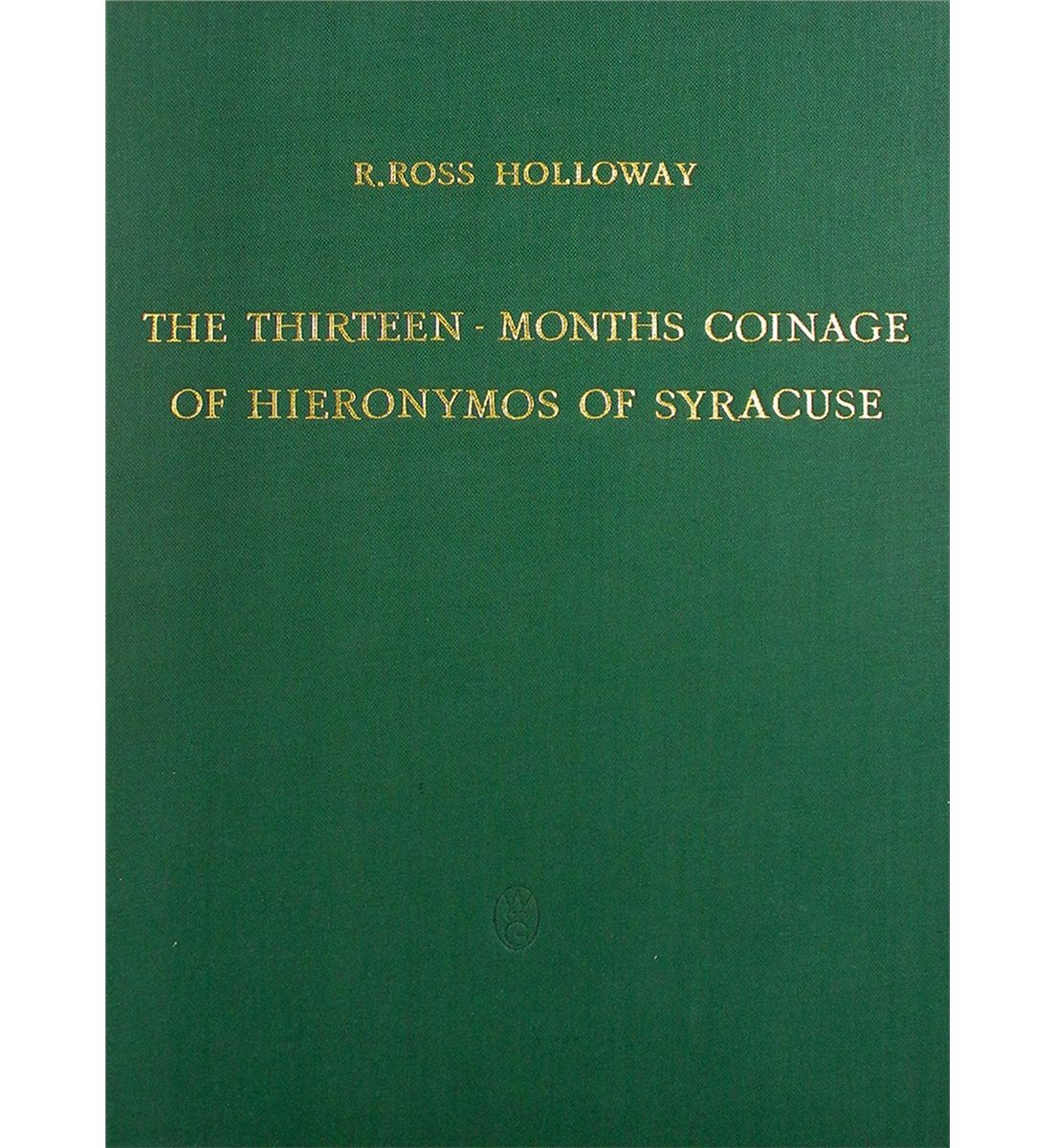Holloway, R. Ross. THE THIRTEEN-MONTHS COINAGE OF HIERONYMOS OF SYRACUSE. Berlin: Deutsches Archäologisches Institut, 1969. 4to, original green cloth, gilt. xxiii, 47, (1) pages; 12 fine plates of coins. Fine. Infrequently offered. Clain-Stefanelli 2265. Daehn 3159: "Examines the Syracusan coins of 215-214 B.C."
