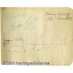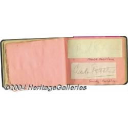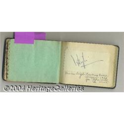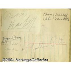<B>Hollywood Autograph Book (circa 1940).</B></I> This well-worn little book holds a treasure trove of Hollywood autographs from many big-name stars. Many are well-known (John Wayne, Boris Karloff [one of the biggest names in Horror cinema], Vivian Leigh, Greer Garson, James Stewart, Susan Hayward, Judy Garland, Ida Lupino, Basil Rathbone, Olivia DeHavilland), some were big in their day (Freddy Bartholomew, Raymond Massey, Zasu Pitts, Victor Mature, Cesar Romero, Claire Trevor, Joan Fontaine, Jon Hall, Dennis O'Keefe, Hedda Hopper), some have been forgotten by today's fans (Pinky Tomlin, Florence Rice, Walter Abel, Alan Mobrey, Blanche Yurka, Mary Carlisle), names that rarely turn up in the marketplace. Incredible! Many signatures are in pencil; a number were written on separate pieces of paper that have been glued in. Approximately 80 autographs make up this book, once owned by a very lucky young lady. Put the right bid on this one, and you might be the next lucky owner! <I>Accompanied by COA from PSA/DNA. </B></I> <BR><BR><B>Important notice:</B> Heritage usually auctions material at the rate of 200-250 lots per hour. On some occasions eBay Live bid software or the Internet may not be able to keep up with the pace of the auction. We recommend placing a realistic absentee bid now as insurance to avoid disappointment. Occasionally the auctioneer may eliminate or reject an eBay Live bid, and the auctioneer may also reopen a lot after the close of the eBay live bidding (usually because we missed an audience bid), and may reject your bid even if it shows you as the winning bidder. By bidding via eBay Live, you agree that Heritage may award the lot to another bidder at its sole discretion under the circumstances described above or any other reasonable circumstances. Since eBay bids are not shown to us until we open the lot on the floor, we treat those bids just like floor bids. In most cases the floor responds before the eBay bid is presented to us, due to Internet lag time, so for consistency we have made it a policy that floor bids are always considered first over tie eBay live bids. Also please note that all Heritage lots purchased through eBay Live carry a 24.5% Buyer's Premium. Please make sure you read the Terms and Conditions before you bid.
