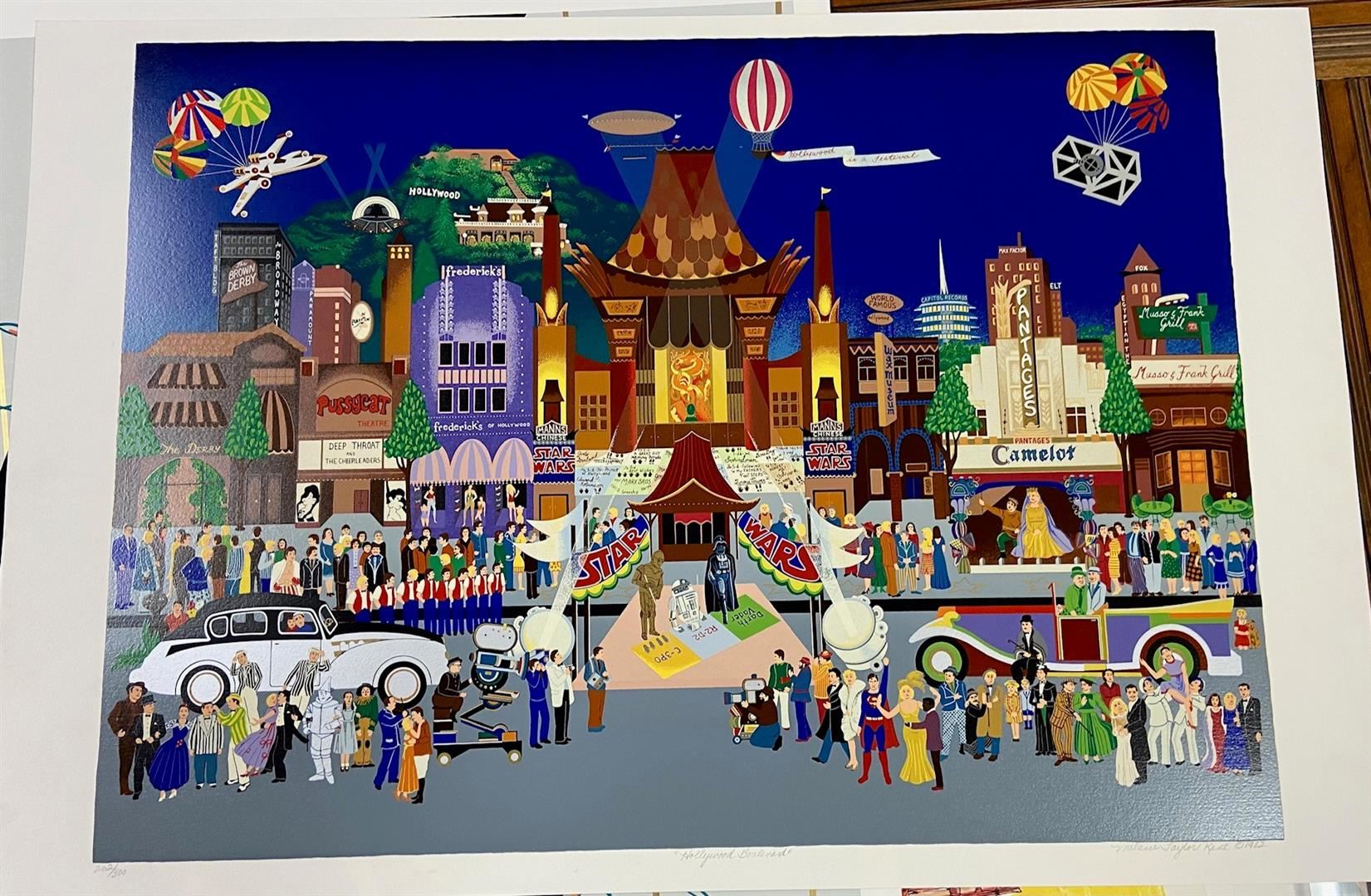 A VINTAGE Melanie Taylor Kent serigrapgh of the famous Hollywood Blvd. as it looked back in the late 1970's. Unframed 25x35", pencil signed and numbered 202/300