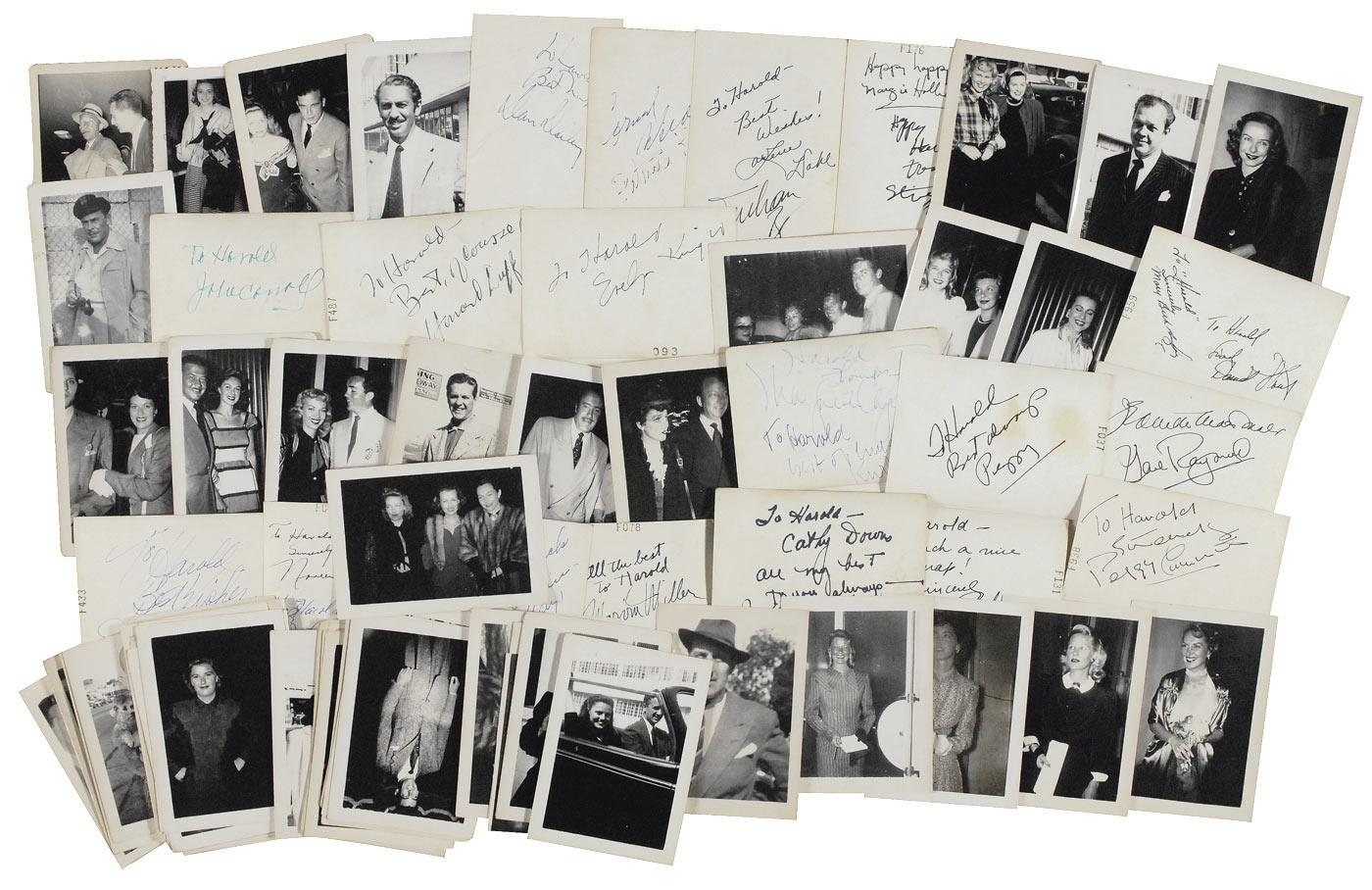 Eighty-six signed candid photos, each approximately 3.25 x 4.5 or 4.5 x 3.25, each signed in ink on the reverse by the celebrity pictured. Most of the photos are inscribed. Highlights include: Anne Baxter and John Hodiak, Constance Bennett, Jim Davis, Joan Fontaine, John Hall and Frank Langford, Paul Henreid, Evelyn Keyes, Fred MacMurray, Virginia Mayo, Edmond O’Brien, Eleanor Parker, Anne Revere, Rosalind Russell (2), Robert Stack, Vera-Ellen, Shelley Winters, Anne Jeffreys, Jeanette Macdonald, Gene Raymond, Cornel Wilde, Rory Calhoun, Van Johnson, Barbara Bel Geddes, Gloria DeHaven, Patricia Neal, Signe Hasso, Constance Moore, and Jane Wyatt. Accompanied by five unsigned celebrity snapshots. In overall very good condition, with light surface impressions, varying amounts of handling wear, and brushing and some light contrast to portions of a couple of signatures.
