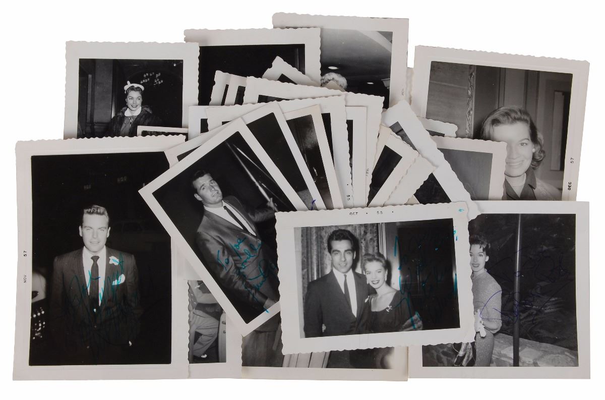 The 425 unsigned photos include names such as Ralph Bellamy, Joan Blondell, Dirk Bogarde, Pat Boone, Jeremy Brett, Perry Como, Sean Connery, Joan Crawford (shown signing an autograph), James Darren, Bette Davis, Doris Day, Ella Fitzgerald, Ava Gardner, James Garner, Stewart Granger, Alec Guinness, Katharine Hepburn (on her bike), Lena Horne, Rock Hudson, Tab Hunter, Michael Landon (30 different), Jack Lemmon, Gina Lollobrigida, Anna Magnani, Johnny Mathis (very young), Yves Montand, Kim Novak, Donna Reed, Cliff Robertson (60 different), Maria Schell, Jean Seberg, Robert Stack, Stuart Whitman, and Michael York.