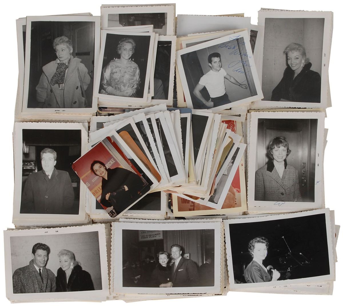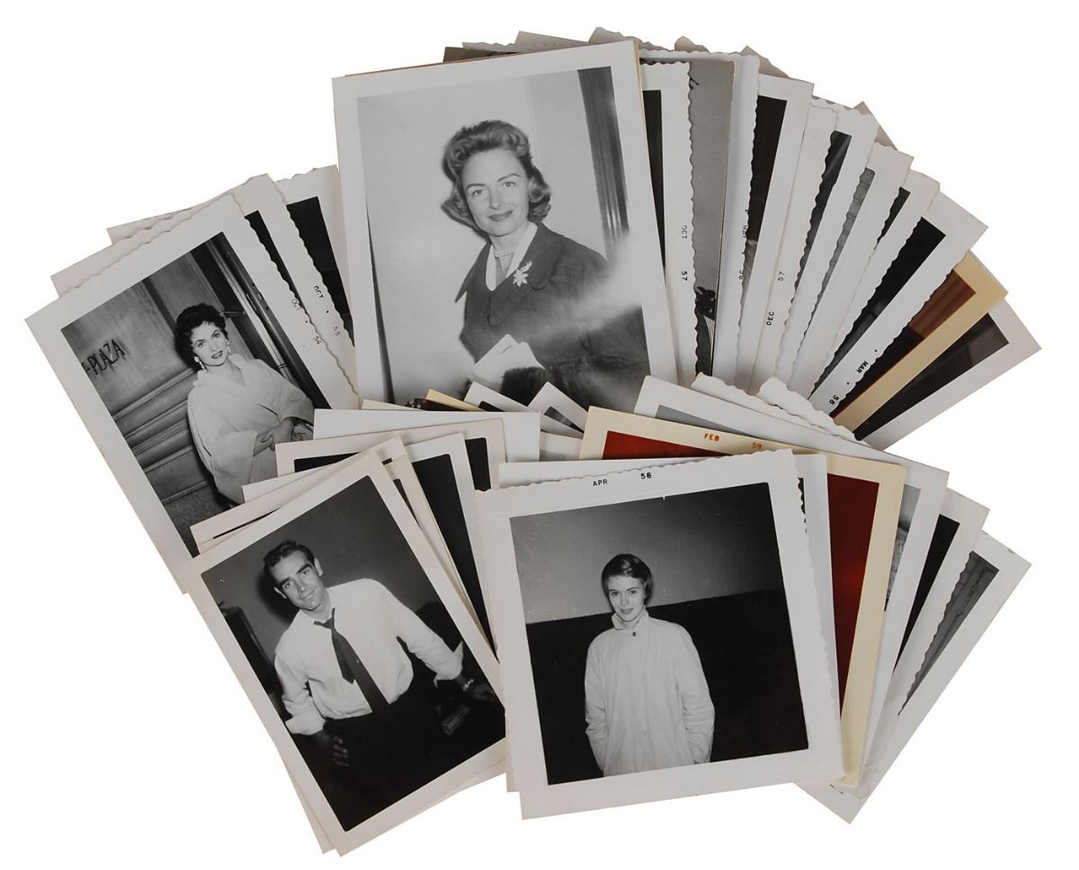 Wonderful collection of 525 vintage one-of-a-kind candid photos of actors and actresses taken between 1955 and 1958; sizes range from roughly 3.5 x 2.5 up to 3.5 x 5, and most are black and white, although there are a smattering of color photos as well. The good-natured subjects are generally posed outside of theaters (occasionally with the collector who took these pictures, a spouse, or an admiring fan), while others are shown emerging from cars, out for a night on the town, or lightly hamming it up for the camera.