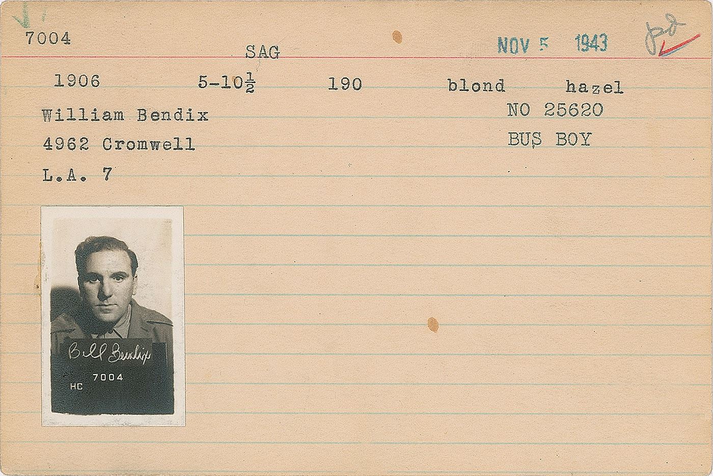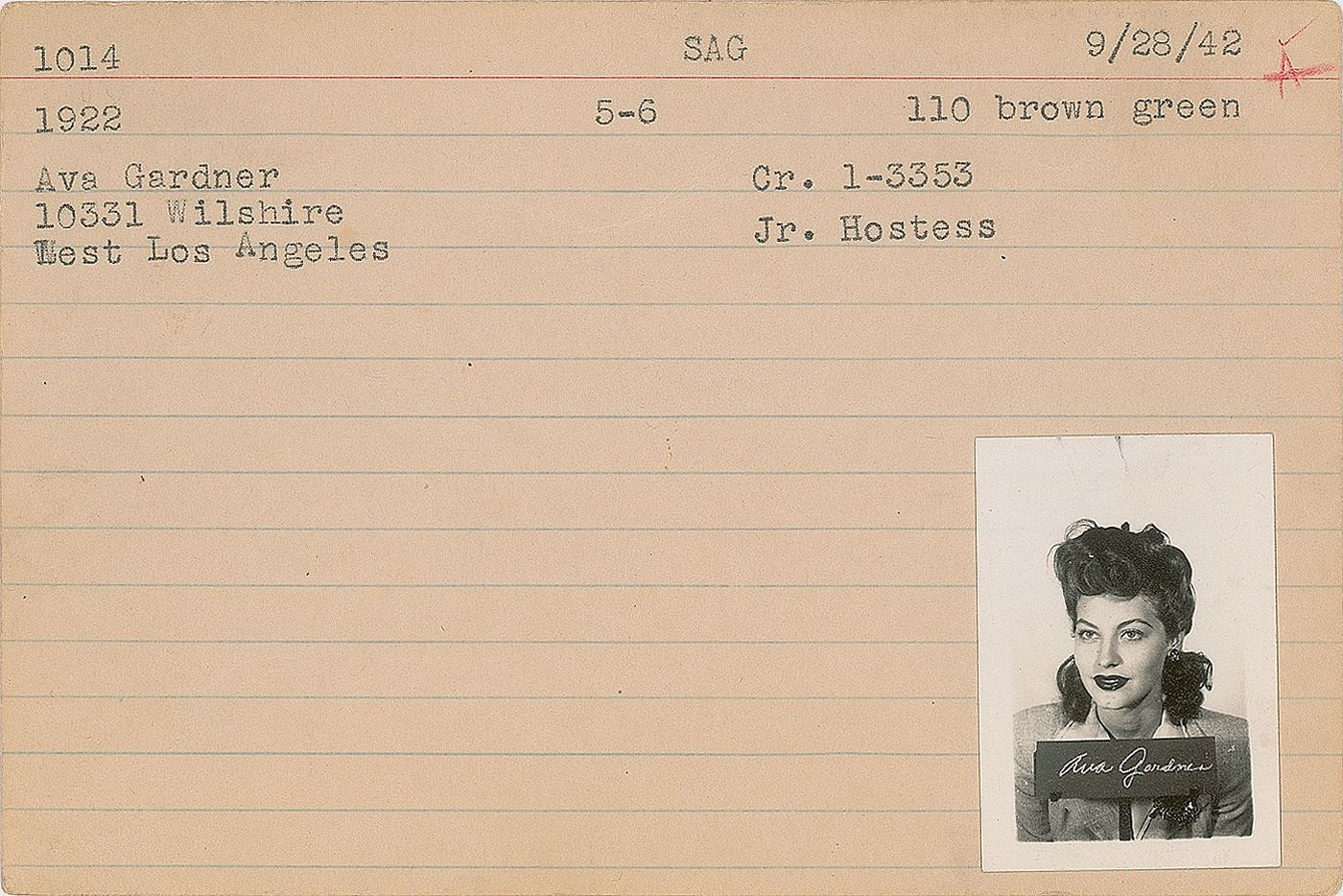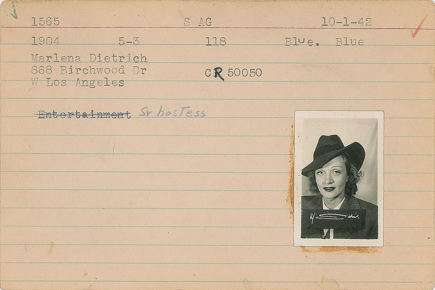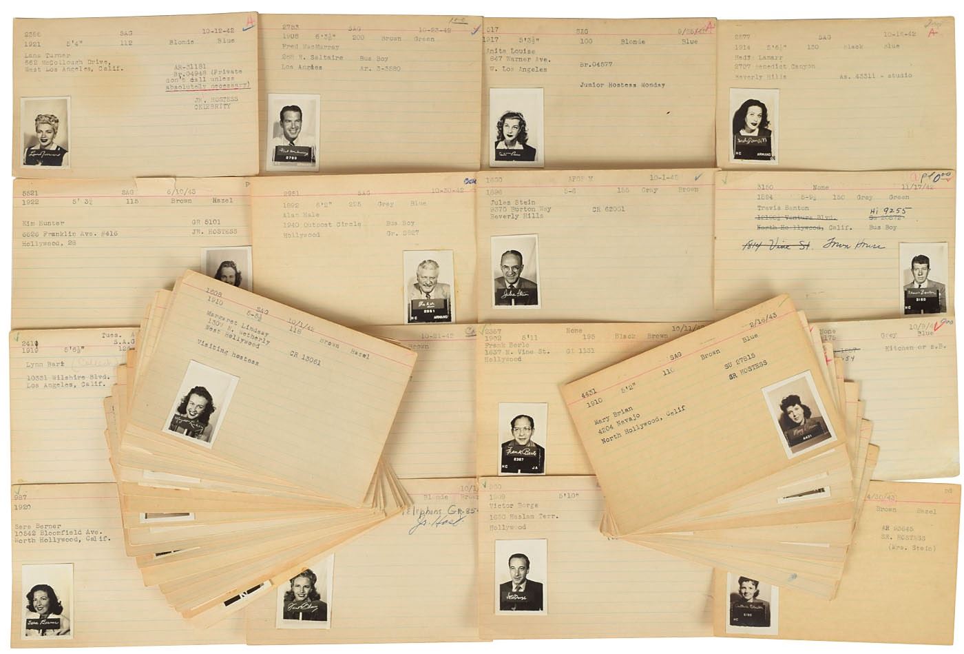 Rare and spectacular group of 54 volunteer service cards for celebrities who staffed the Hollywood Canteen during World War II, each 6 x 4, filled out in type with personal addresses and phone numbers, physical descriptions, and dates of their service, all bearing small affixed portraits with facsimile signatures. Major stars include: Rita Hayworth, Marlene Dietrich, Lana Turner, Ava Gardner, Hedy Lamarr, William Bendix, Janet Blair, Jules Stein, Victor Borge, Dane Clark, Barbara Hale, Fred MacMurray, Shelley Winters, Alan Hale, Sr., Loretta Young, and more. In overall fine condition, with light scattered toning. During WWII, the Hollywood Canteen was known worldwide as the celebrity entertainment center for US servicemen. It was staffed primarily by volunteers from the Hollywood celebrity set—from starlets to major stars, writers to directors, and their families. All non-servicemen workers there had to be fingerprinted and approved by the FBI. It is our understanding that a worker had to have a card on file to get into the club, and these fantastic cards served to identify the person coming in to volunteer was indeed who they claimed to be, and that they had been cleared by the FBI to have access to American servicemen during wartime. These cards record personal details of these celebrity volunteers, and many are annotated on the reverse with the dates that they worked. The excitement of the Hollywood Canteen was glamorized in movies, newsreels, newspapers and radio broadcasts worldwide. A decidedly unique and glamorous grouping connecting the heroes and heroines of Hollywood with those in the American military during the Second World War.