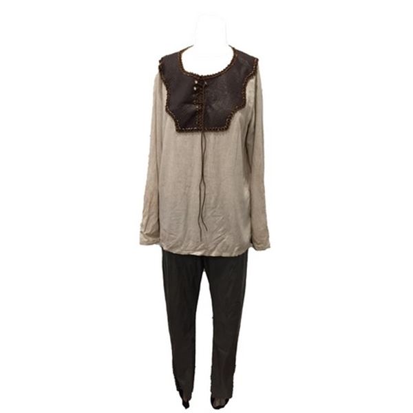 Rings of Power (2022) - Elrond (Robert Aramayo) test cream tunic shirt with pleather shoulders and pleather brown pants. The costume was never worn in
