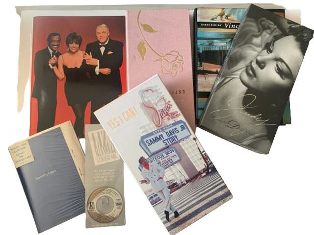A collection of Hollywood Legends CD sets. Also included is a hard cover coffee table book called "Directed by Vincente Minnelli", a promotional demo for Liza Minnelli at Carnegie Hall’s music as well as a So Sorry I said Liza Minnelli CD with free greeting cards and a program featuring Liza Minnelli, Sammy Davis Junior and Frank Sinatra when they all performed together. The CD sets included are from Sammy Davis Junior - The Sammy Davis Junior story, Judy Garland - the complete Decca masters plus and Barbra Streisand - Just for the Record.