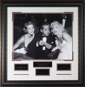 Humphrey Bogart was an American screen actor who, with performances in films during the 1940s such as The Maltese Falcon, Casablanca, and The Big Sleep, became widely regarded as a cultural icon. In 1999, the American Film Institute ranked Bogart as the greatest male star in the history of American cinema. Lauren Bacall was an American actress known for her distinctive voice and sultry looks. She began her career as a model. In 1999, Bacall was ranked 20th out of the 25 actresses on the AFI's 100 Years...100 Stars list by the American Film Institute. Marilyn Monroe was an American actress, model, and singer, who became a major sex symbol, starring in a number of commercially successful motion pictures during the 1950s and early 1960s. This is a Lauren Bacall, Humphrey Bogart, and Marilyn Monroe custom premium leather framed unautographed Replica Signature Engraved oversize 30x30 piece.
