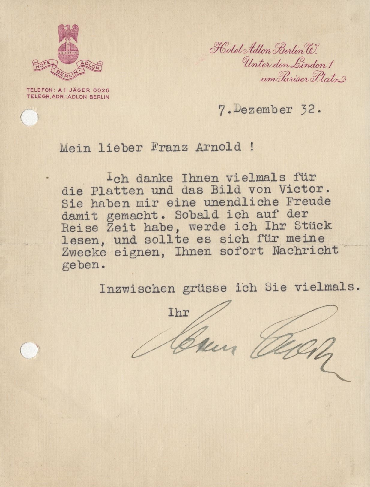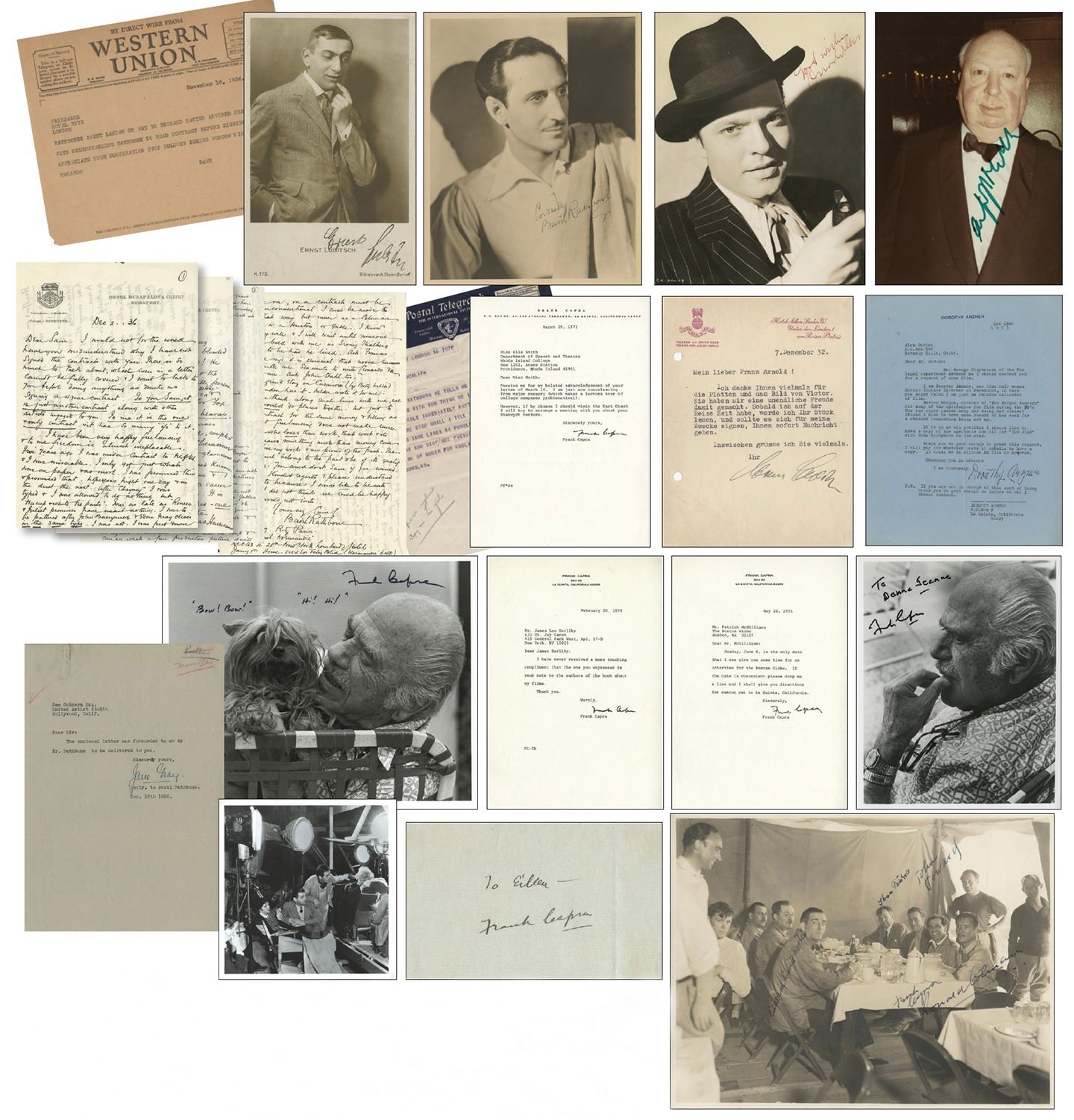 142. [Hollywood]. Lot of (12) signed items including photos and ephemera from legendary film directors, plus extraordinary Basil Rathbone handwritten letter to Samuel Goldwyn.(ca. 1930s-1970s) Including [1] Orson Welles 7.25 x 9.5 in. (184 x 241 mm.) photo signed, "Good wishes, Orson Welles"; [1] Frank Capra and Lost Horizon cast 9.5 x 7.25 in. (241 x 184 mm.) photo signed, "Edward Everett Horton", "John Howard", Ronald Colman", "Thomas Mitchell", and "Frank Capra"; [3] typed letters on Frank Capra La Quinta California stationary, all signed "Frank Capra" (1-retaining transmittal envelope); [1] clipped 5 x 3.5 in. (127 x 76 mm.) signature "To Eileen - Frank Capra"; [1] 8 x 10 in. (203 x 254 mm.) photo of the director with his dog and above them, "bow! wow!" and "hi Frank Capra"; [1] 8 x10 in. (203 x 254 mm.) photo signed, "To Donna Jeanne Frank Capra"; [1] Ernst Lubitsch 3.5 x 5.25 in. (76 x 133 mm.) real photo postcard signed "Ernst Lubitsch"; [1] Alfred Hitchcock 3 x 4.5 in. (76 x 114 mm.) color snapshot signed, "Alfred Hitchcock"; [1] Dorothy Arzner 8 x 10 in. (203 x 254 mm.) typed letter requesting Alex Gordon send her a copy of her project Don Juan, signed, "Dorothy Arzner", [1] Ernst Lubitsch 5 x 6 in. (127 x 152) typed letter in German to playwright Franz Arnold thanking him for "the records and picture", signed, "Ernst Lubitsch". All exhibiting some age and handling. In overall very good to fine condition. Basil Rathbone autograph letter signed ("Basil Rathbone") to Samuel Goldwyn and related telegrams and documents, 6-pages on 2-integral 8 x 11.25 in. (203 x 279 mm.) leaves of Hotel Dunapalota, Ritz Budapest stationery, 2 December 1936. Rathbone writes to studio head Samuel Goldwyn regarding a delay in contract signing, in part: ...Five years ago I was under contract to M. G. M. & I was miserable...After Cheney', I was typed & I was allowed to do nothing but teacup & white tie parts.'...I accepted Count Anteoni in The Garden of Allah' [without reading the script because David Selznick told me the story & the part as he told it was colourful & vital & important. We came to shoot it & it was nothing...I must either be very important to you or I will go on freelancing. I earned $120,000 last year and $140,000 this...it is not money I am after (much as I appreciate it!) I have been a very important actor both in London & New York for years... The letter is accompanied with related letters and telegrams. Fine condition. $600 - $800
