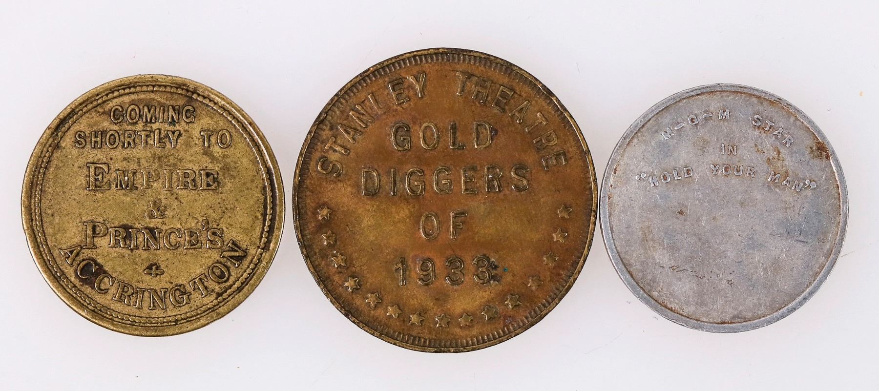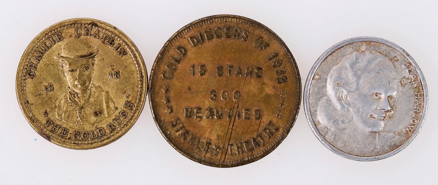 Three movie star medals: 1) Jean Harlow MGM star in "Hold Your Man,"; Wm, rd., 25 mm. 2) Charlie Chaplin in "The Gold Rush,"; Br., rd., 26 mm. 3) Gold Diggers of 1933 / Stanley Theatre; Br., rd., 30 mm.