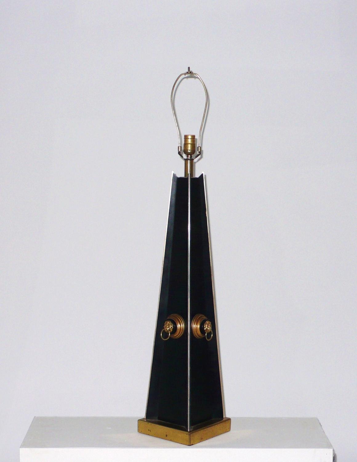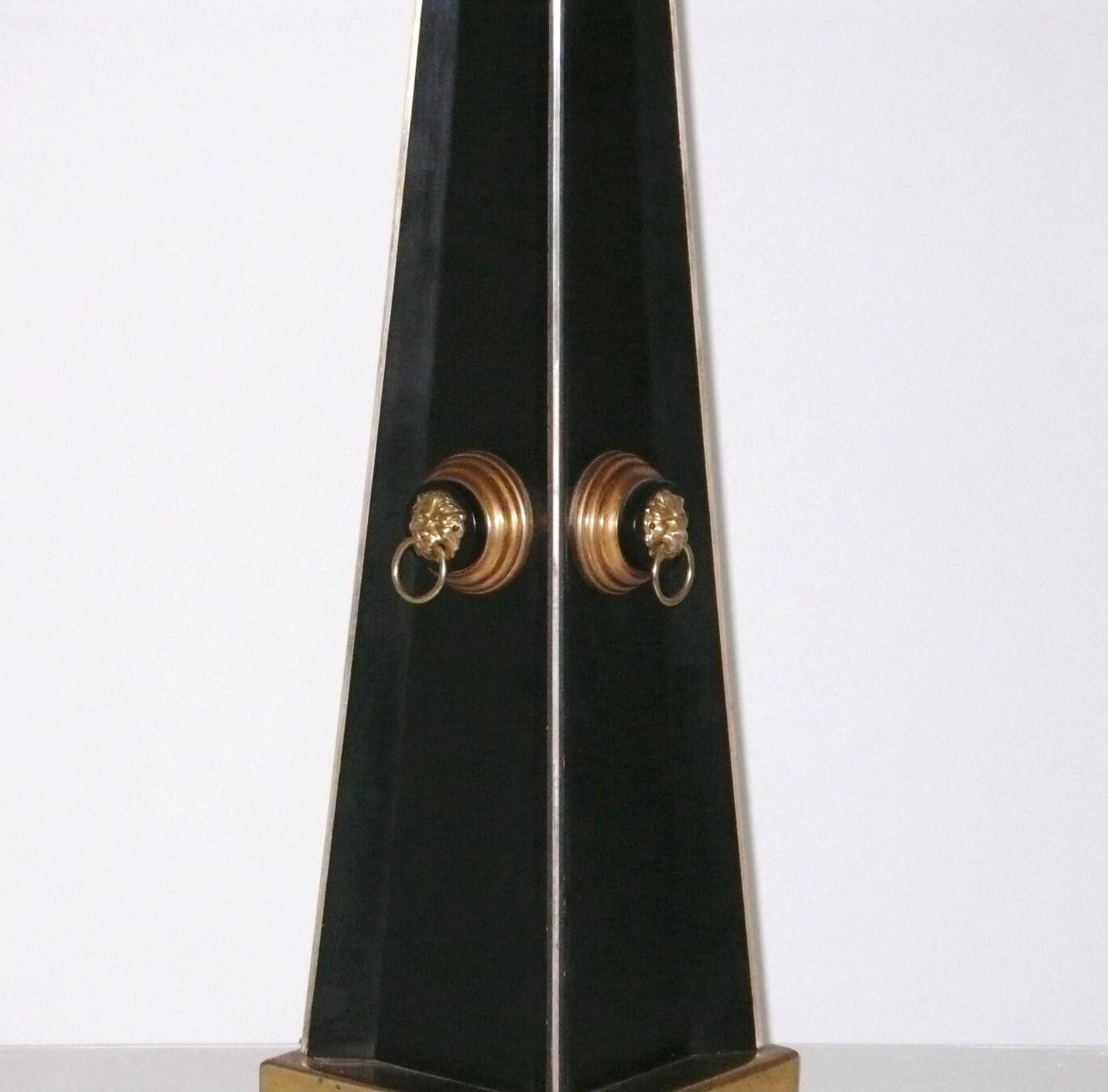 42h x 9w x 9d inches, brass, black painted wood, brass lion decoration
