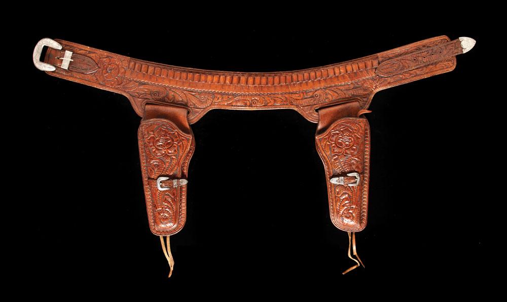 Double buscadero style belt and holster rig for 7 1/2” Colt Single Actions. Marked on belt, both holsters and all buckles. The belt has a 1 1/2” sterling buckle set while the holsters each have 5/8” – 3 piece sets. Deep, intricate tooling, 3 1/2” belt with large caliber loops. Very good condition.