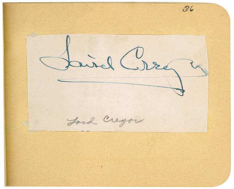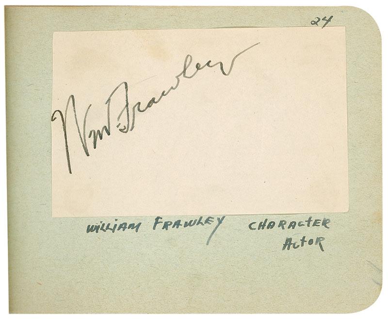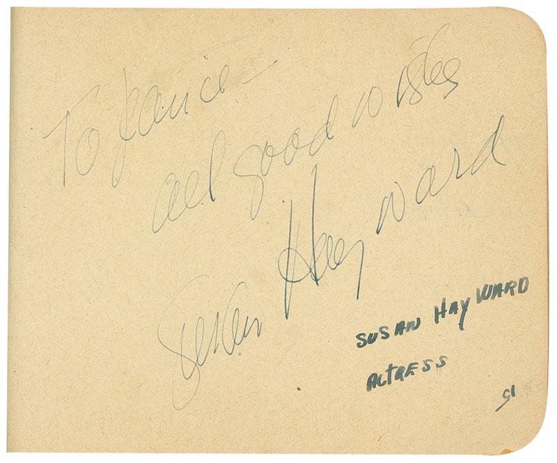 Vintage softcover autograph album, 6.25 x 4.75, dating from the 1940s, signed inside in ink or pencil by 43 stars of film or stage. About half of the signatures are cut from another source, including lightly-lined slips, then pasted onto a page. Signers include: Bud Abbott, Lionel Barrymore, Laird Cregar, William Frawley, Susan Hayward, Edgar Bergen, George Burns, Claudette Colbert, Jackie Cooper, Olivia de Havilland, Dorothy Lamour (signed "Dottie Lamour"), Agnes Moorehead, Donald O'Connor, and Penny Singleton. With only a few exceptions, each signature appears on its own sheet with some inscribed. In very good condition, with mild rippling and scattered soiling. The book's original owner wrote on the first page that the item bears signatures from "movie and radio stars all gotten in person at the Hollywood Restaurant 'Brown Derby' and Hollywood Broadcasting Offices."