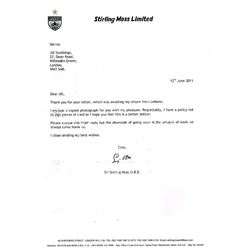 A signed letter from the Racing car driver Stirling Moss on his letter head. No signed photo is included. Letter has been folded and there is a large