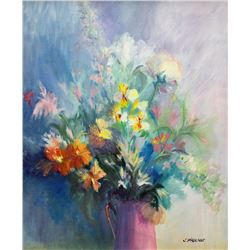 Jacqueline Pigenet (1928-2015) Floral painting titled "Asters et Alstroemeres". Signed lower right and also on verso. Measures 25.5" ...
