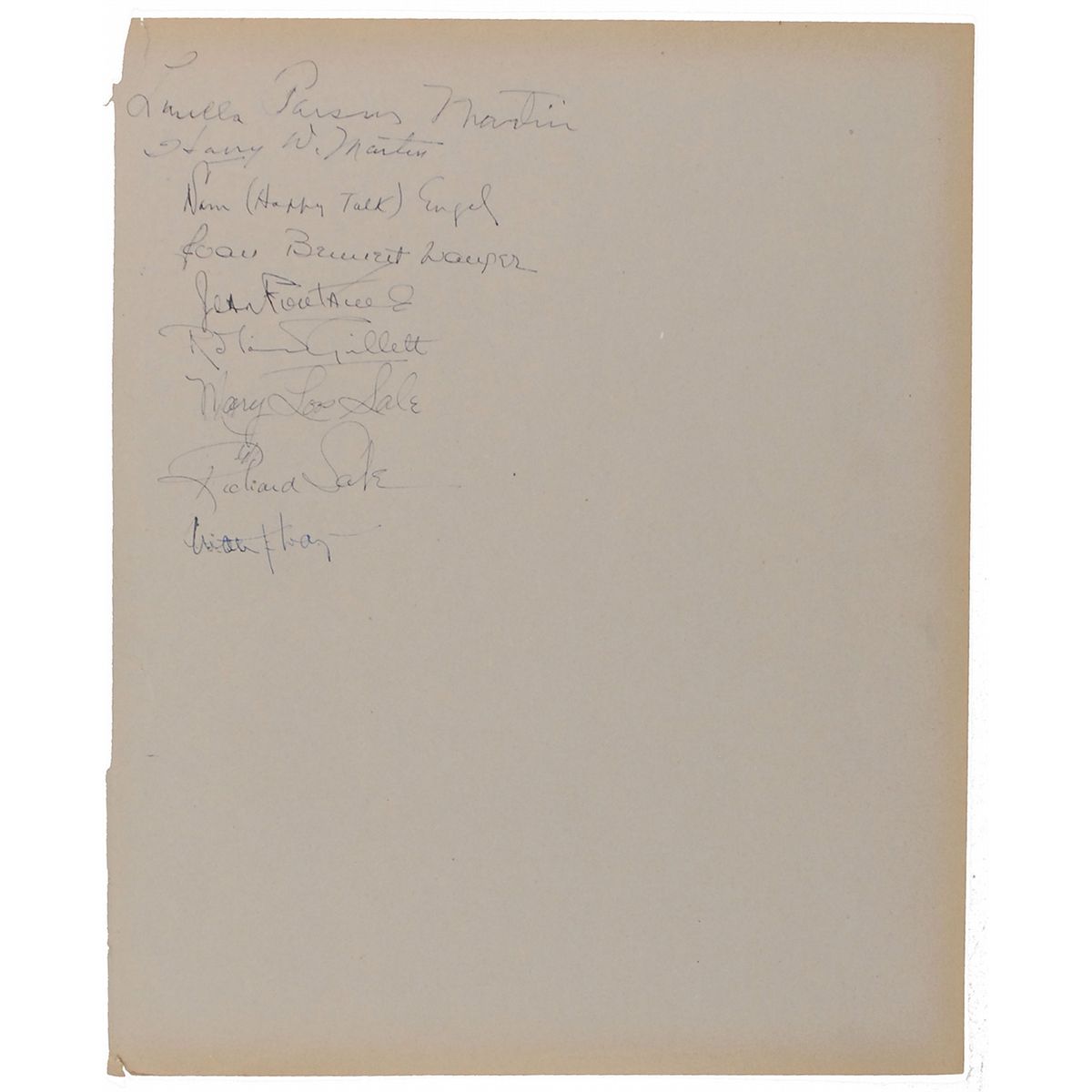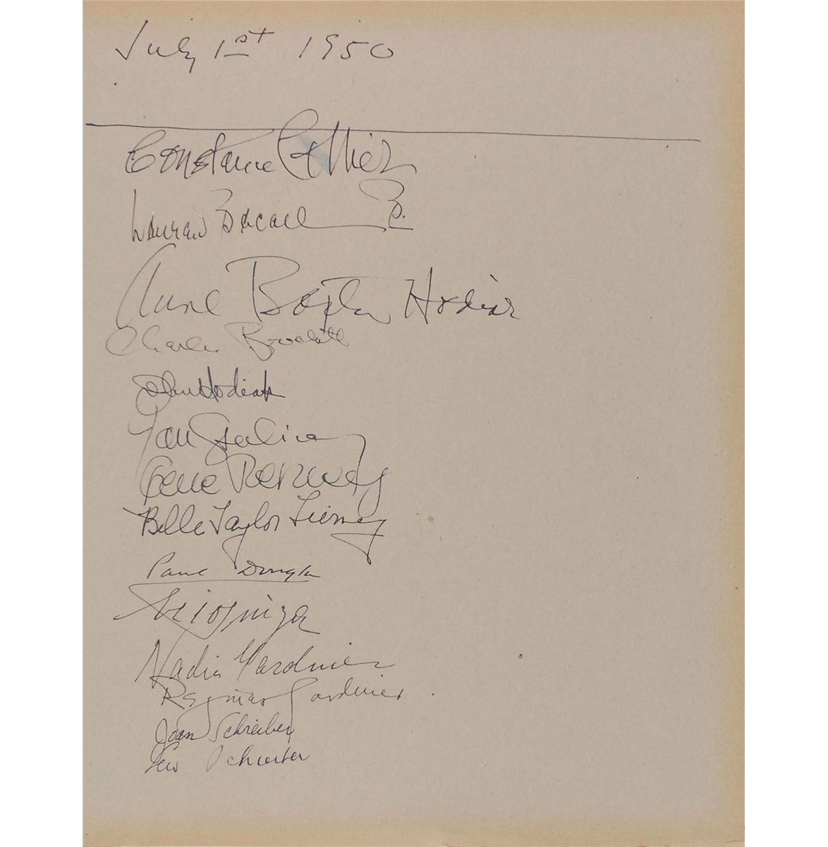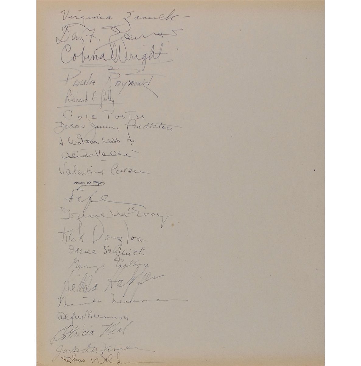 Great collection of 41 signatures of golden-era actors and directors on two 11 x 14 sheets (one signed on both sides), dated July 1, 1950, including: Lauren Bacall, Anne Baxter Hodiak, Joan Bennett Wanger, Charles Brackett, Constance Collier, George Cukor, Kirk Douglas, Paul Douglas, Sam ‘Happy Talk’ Engel, Joan Fontaine, Nadia Gardiner, Roland Gillett, John Hodiak, Hedda Hopper, Mary Loos Sale, Harry W. Martin, Irene McEvoy, Patricia Neal, Arthur Newman, Martha Newman, Louella Parsons Martin, Dodo Pendleton, Jimmy Pendleton, Ezio Pinza, Cole Porter, Paula Raymond, Richard Sale, Joan Schreiber, Lew Schreiber, Irene Selznick, Jan Sterling, Richard E. Sully, Belle Taylor Tierney, Gene Tierney, Alida Valli, Walter F. Wanger, Jack Warner, J. Watson Webb, Jr., Cobina Wright, Darryl F. Zanuck, and Virginia Zanuck. In fine condition, with light toning to edges.