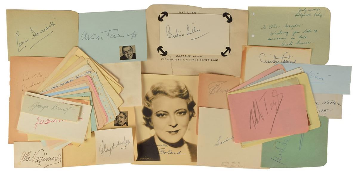 Collection of more than 80 vintage ink signatures of actors and actresses on various slips, cards, and album pages, including: Annabella, Richard Arlen, Edward Arnold, Tallulah Bankhead, Leslie Banks, Lex Barker, Gertrude Berg, Mary Boland, George Brent, Joe E. Brown, Virginia Bruce, Spring Byington, Claudette Colbert, Jeanne Crain, Broderick Crawford, Xavier Cugat, Cass Daley, Bebe Daniels and Ben Lyon, Linda Darnell, Marion Davies, Dolores Del Rio, Brian Donlevy, Billie Dove, Jimmy Durante, Anita Ekberg, William Frawley, Franciska Gaal, Ava Gardner, Vittorio Gassman, Janet Gaynor, Jack Gilford, Paulette Goddard, Bonita Granville, Sid Grauman, Neil Hamilton, Cedric Hardwicke, Sterling Holloway, Miriam Hopkins, Hedda Hopper, Edward Everett Horton, Louise Hovick, Victor Kilian, Andrea King, Laura La Plante, Margaret Landry, Beatrice Lillie, Anita Louise, William Lundigan, Ida Lupino, Aline MacMahon, Jean Marais, Joan Marsh, Ethel Merman, Alla Nazimova, Lloyd Nolan, Reginald Owen, Barbara Pepper, Molly Picon, ZaSu Pitts, Eleanor Powell, Robert Preston, Dennis Price, Luise Rainer, Gene Raymond, Dick Shawn, Ann Sheridan, Kent Smith, James Stewart, Lewis Stone, Akim Tamiroff, Robert Taylor, Franchot Tone, Lana Turner, Miyoshi Umeki, Robert Wagner, Virginia Weidler, Arleen Whelan, Cornel Wilde, Roland Winters, and Vera Zorina. In overall very good to fine condition. Accompanied by unsigned photos of many of the signers.