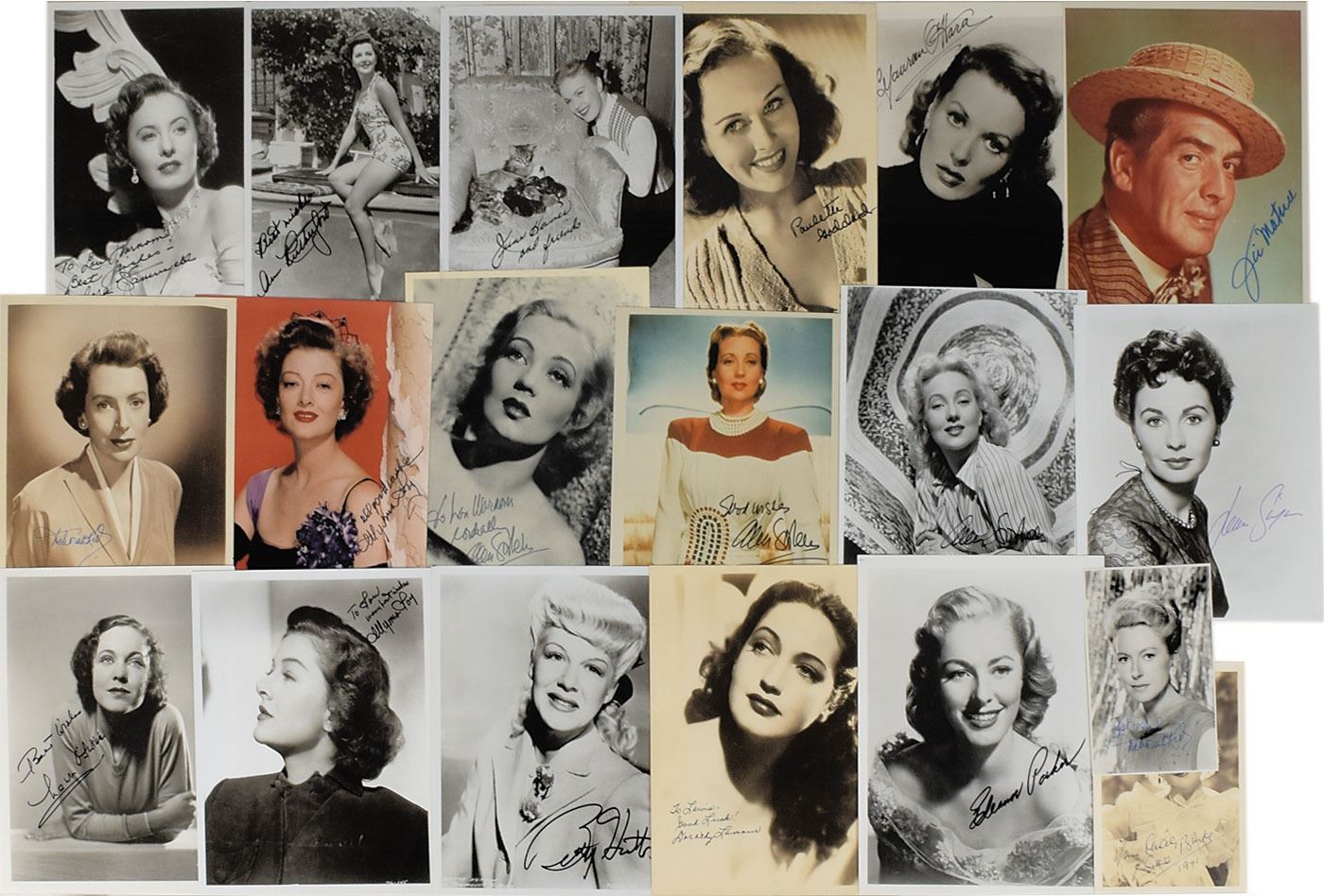 Collection of nineteen photos, mostly glossy, ranging in size from 4 x 6.25 to 8 x 10, each signed in ink or felt tip by the pictured Hollywood actor or actress, including: Billie Burke (ins), Paulette Goddard, June Haver, Betty Hutton, Deborah Kerr (2), Dorothy Lamour (ins), Myrna Loy (2, one ins), Victor Mature, Maureen O’Hara, Maureen O’Sullivan, Eleanor Parker, Ann Rutherford, Jean Simmons, Ann Sothern (3), and Barbara Stanwyck (ins). In overall fine condition.