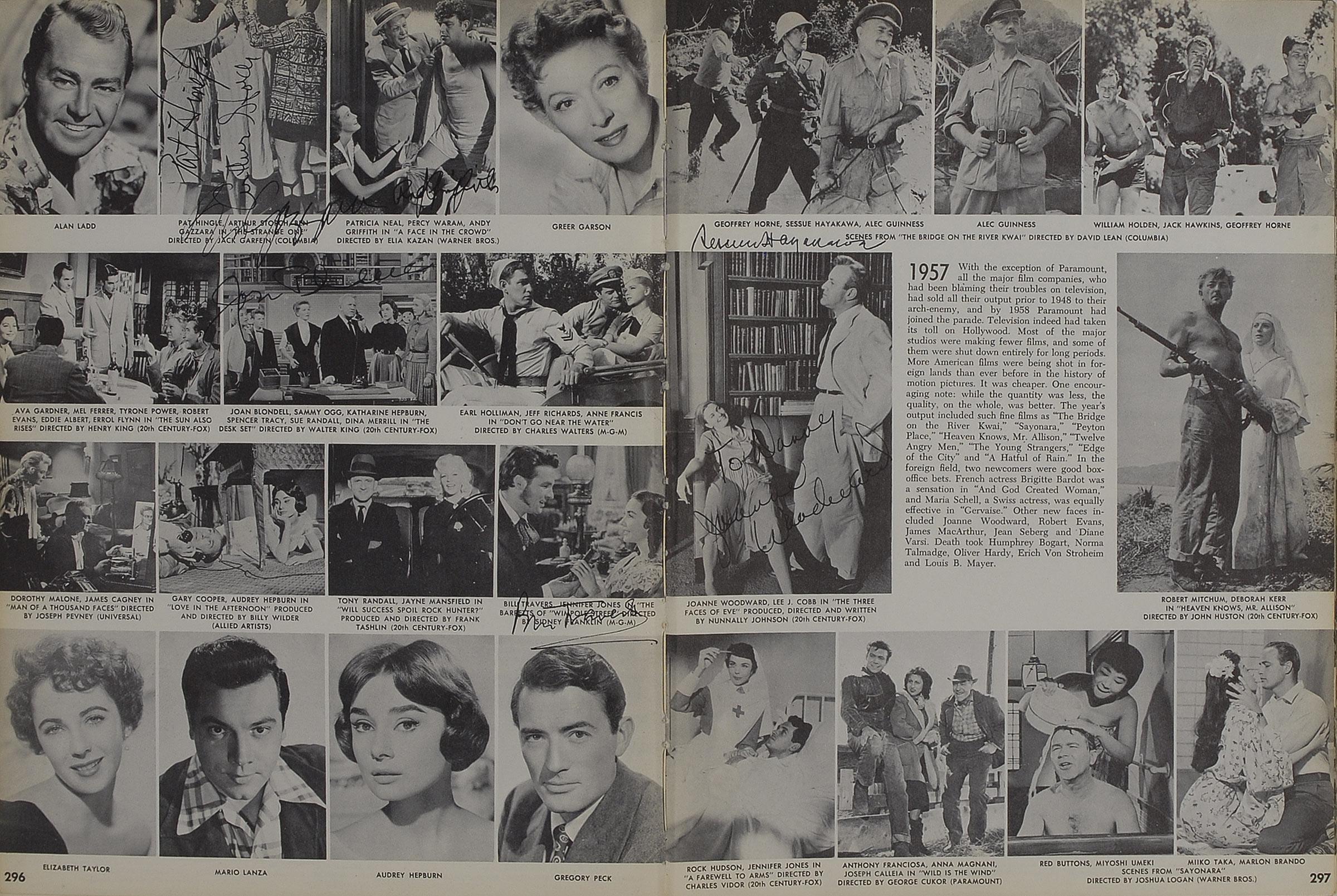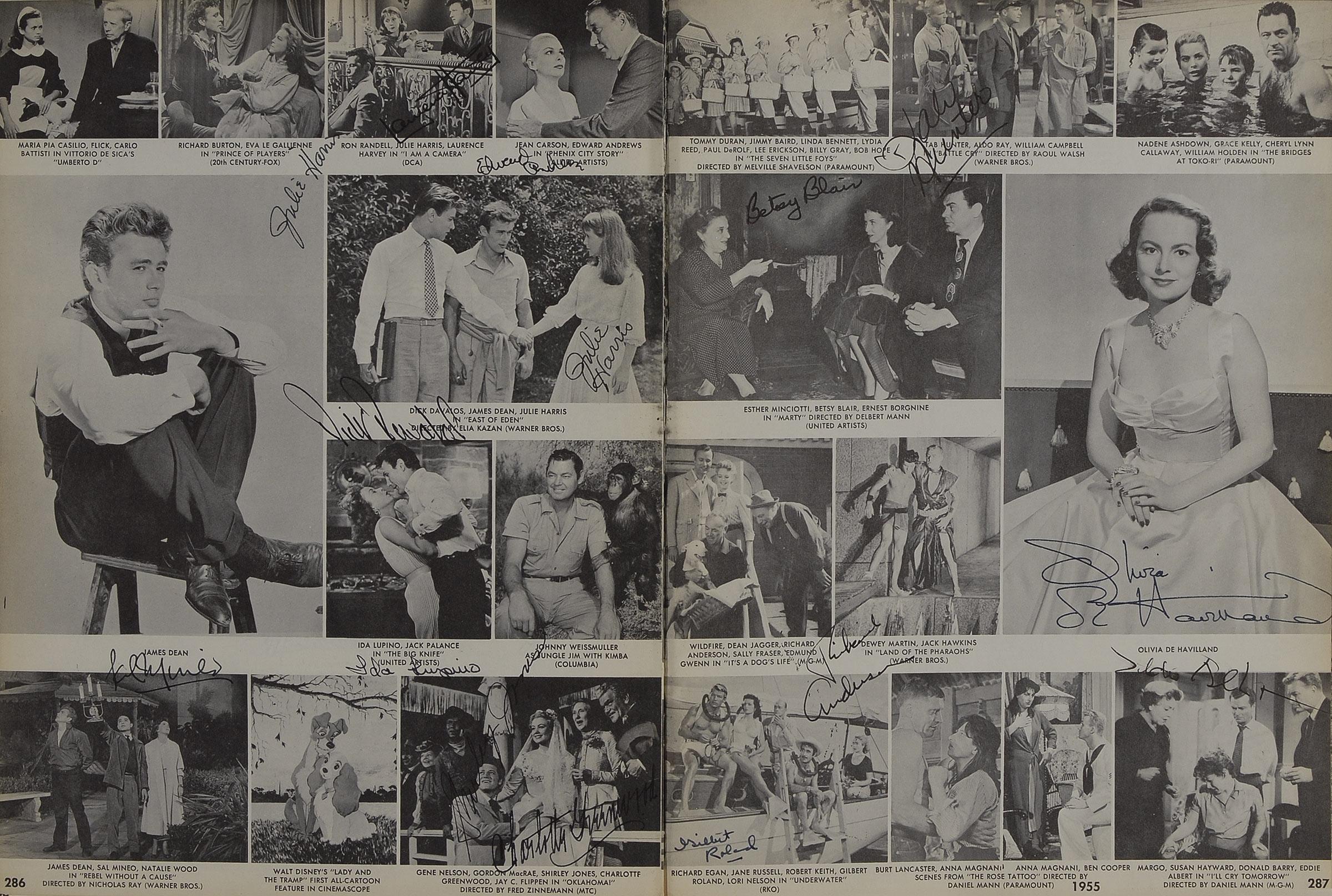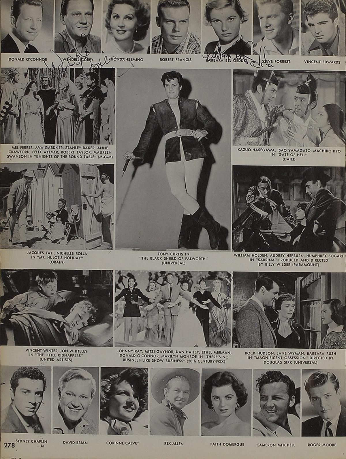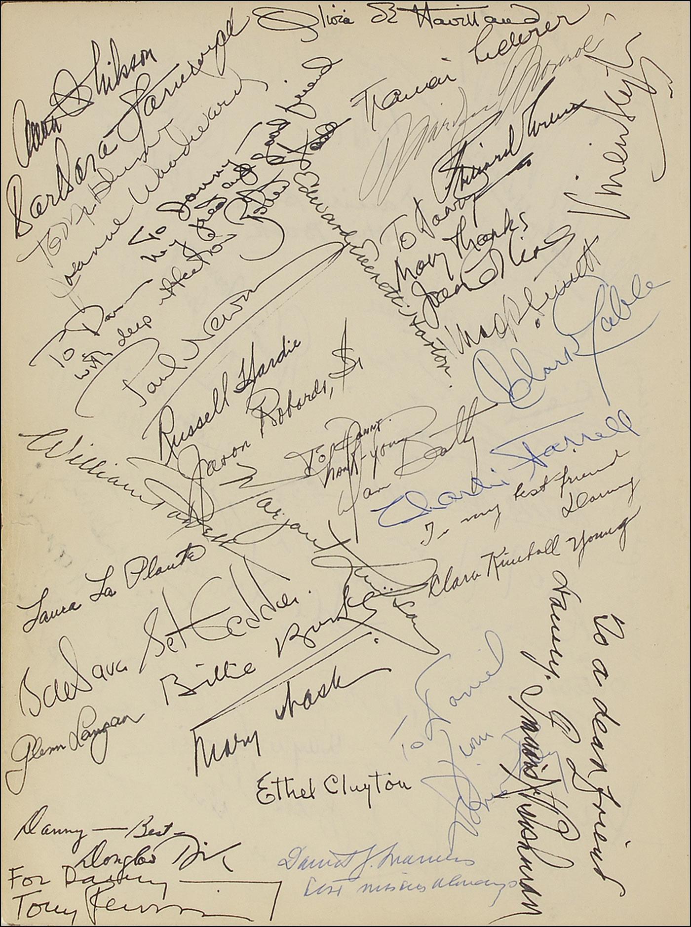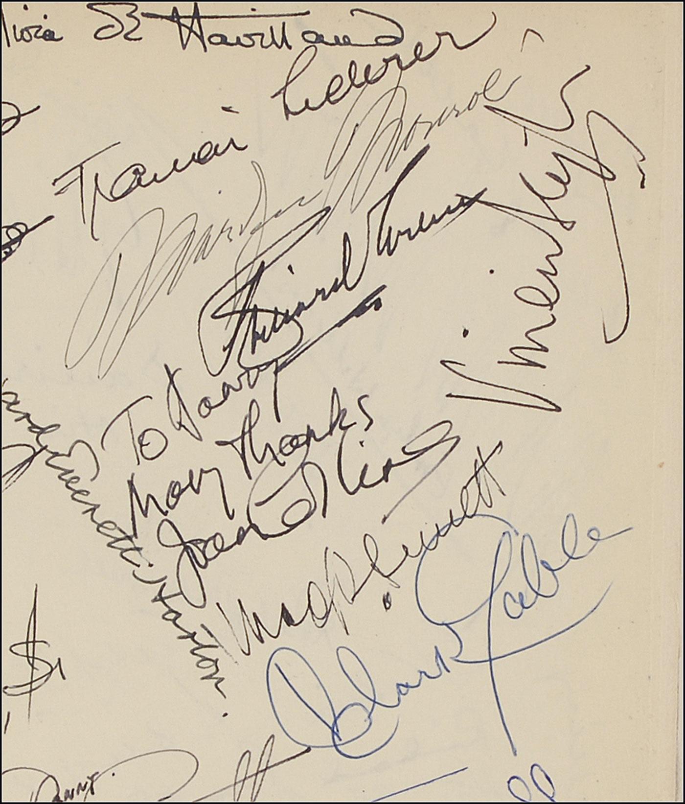 A complete list of signers are: Max Adrian, Anna Maria Alberghetti (2), Eddie Albert (4), Robert Alda, Elizabeth Allen, Claude Allister (2), Glenn Anders, Richard Anderson, Keith Andes (4), Andrews Sisters (Patty, LaVerne, and Maxine), Edward Andrews, Richard Arlen (10), Mischa Auer (4), Lew Ayres (9), Hermione Baddeley, Fay Bainter (7), Diana Barrymore (3), Richard Barthelmess (10), Warren Beatty, Barbara Bel Geddes (6), Ralph Bellamy (6), Gertrude Berg, Leonard Bernstein, Sidney Blackmer (3), Vivian Blaine (3), Betsy Blair, Joan Blondell (9), Claire Bloom (2), Mary Boland (10), Shirley Booth, Lee Bowman (2), Eddie Bracken, Scott Brady (2), Keefe Brasselle (4), Bobby Breen, Lloyd Bridges, Joe E. Brown (4), Horst Buchholz, Billie Burke (5), Francis X. Bushman (2), Carleton Carpenter (2), Nancy Carroll (5), Joan Chandler, Fred Clark, Ethel Clayton (2), Joan Collins (3), Frank Conroy (2), Jackie Coogan (3), Gladys Cooper (4), Jeff Corey, Wendell Corey (3), Joseph Cotten (2), Hume Cronyn, Arlene Dahl (2), James Daly, Henry Daniel, Jules Dassin, Dick Davalos, Bette Davis (30), Doris Day (5), Howard de Silva, Brandon de Wilde, Olive Deering (2), Gloria DeHaven (2), Olivia de Havilland (20), Albert Dekker (2), Dolores Del Rio (6), Gabriel Dell (2), Reginald Denny (9), Richard Derr (4), Douglas Dick (9), Jean Dixon, James Dobson (2), Ruth Donnelly (2), Billie Dove (5), Howard Duff (5), Deanna Durbin, Nelson Eddy (3), Leif Erickson (4), Maurice Evans (2), Aldo Fabizi, Nanette Fabray, Charles Farrell (5), Elsie Ferguson (2), José Ferrer (3), Betty Field (10), Bramwell Fletcher (2), Errol Flynn (7), Lynn Fontanne, Paul Ford, Ruth Ford, Bob Fosse, Howard Freeman, Clark Gable (6), Eva Gabor, James Garner (3), Peggy Ann Garner (2), Betty Garrett, Greer Garson, Janet Gaynor (12), Ben Gazzara (2), Leo Genn, John Gielgud (3), Dorothy Gish (3), Lillian Gish (7), Hermione Gold, Betty Grable (3), Farley Granger (5), Fernand Gravet (3), Kathryn Grayson (6), Charlotte Greenwood (7), Ethel Griffies, Andy Griffith (2), Hal Hackett (2), Juanita Hall, Margaret Hamilton, Russell Hardie (7), Julie Harris (3), Rosemary Harris, Paul Hartman, Laurence Harvey (3), Hurd Hatfield (3), Sessue Hayakawa (3), Helen Hayes (12), Rosemary Hayes, Dick Haynes (2), Eileen Heckart (2), Van Heflin (7), Katharine Hepburn, Eileen Herlie (2), Wendy Hiller (2), Pat Hingle, Judy Holliday (3), Celeste Holm (4), Hedda Hopper (7), Lena Horne, Edward Everett Horton (7), Gareth Hughes, Kim Hunter (2), Tab Hunter (6), Richard Hylton (2), Rex Ingram, Leon Janney (2), Anne Jeffries, Allan Jones (3), Shirley Jones (2), John Justin, Kurt Kasznar (2), Howard Kell, Cecil Kellaway (2), Nancy Kelly, John Kerr (3), Mary Kerridge, Terry Kilburn (5), Dennis King (2), Charles Korvin (2), Kurt Kreuger (6), Elsa Lanchester (2), Jesse Royce Landis, Jessie Royce Landis, Glenn Langan (8), Angela Lansbury (4), Laura LaPlante (4), Francis Lederer (5), Vivien Leigh (6), Margaret Leighton (2), Jack Lemmon, Sam Levene (2), Robert Lewis, Beatrice Lillie, Margaret Lindsay (4), Harold Lloyd (7), Jack Lord (2), Claire Luce (2), Keye Luke, John Lund (8), Alfred Lunt, Ida Lupino (11), Diana Lynn (3), Jefferey Lynn, James MacArthur (4), Milo Manfredi, David Manners (8), Enid Markey, Tony Martin (3), Harpo Marx (5), Raymond Massey (3), Mike Mazurki, Mitzi McCall, Mercedes McCambridge (3), Kevin McCarthy (2), Marie McDonald, Roddy McDowall (7), Claire McDowell, Allyn McLerie (3), Ralph Meeker, Adolphe Menjou (12), Melina Mercouri, Burgess Meredith (4), Sal Mineo (2), Marilyn Monroe (5), Ricardo Montalban (2), Dickie Moore (4), Victor Moore (6), Agnes Moorehead (4), Antonio Moreno (4), Karen Morley (4), Wayne Morris (11), Robert Morse (2), Zero Mostel, Alan Mowbray, Patrice Munsel, Conrad Nagel (4), Mary Nash (3), Mildred Natwick, Pola Negri (4), Paul Newman (2), Anna Q. Nilsson (3), Sheree North, Ramon Novarro (9), Hugh O’Brian, Erin O’Brien, George O’Brien (6), Donald O’Connor (3), Dennis O’Keefe (5), Geraldine Page (3), Betsy Palmer, Larry Parks (2), Elizabeth Paterson, Elizabeth Patterson (7), John Payne (6), Alice Pearce, Ann Pennington, Anthony Perkins (8), Brock Peters, Dorothy Peterson (3), Elizabeth Peterson (3), Gerard Philipe (2), Jean Pierre, Christopher Plummer, Sidney Poitier (2), Eleanor Powell (2), William Powell (10), Robert Preston (4), William Price, Luise Rainer (3), Tommy Rall (2), Marjorie Rambeau (5), Andrew Ray, Florence Reed, Walter Reed, Anne Revere, Erik Rhodes (2), Jason Robards Sr (2), Gilbert Roland (12), Lillian Roth (2), Robert Rounseville, Charlie Ruggles (5), Robert Ryan, Joseph Schildkraut (8), Martha Scott (4), Zachary Scott (2), Tonio Selwart, Mack Sennett, Anne Seymour, William Shatner, Ann Shoemaker, Walter Slezak (2), Ethel Smallwood, Robert Stack (15), Lionel Stander (3), Kim Stanley (2), Barbara Stanwyck (15), Frances Starr, Robert Sterling (4), Sophie Stewart (2), Arthur Storch, Susan Strasberg, Gloria Swanson (9), Blanche Sweet (3), Jessica Tandy, Verree Teasdale (2), Joan Tetzel, Michael Tolan, Bill Travers (2), Richard Travis (3), Arthur Treacher, Forrest Tucker (3), Lenore Ulric (5), Rudy Vallee (2), Eli Wallach, Ray Walston, Robert Warrick, Ruth Warrick (3), Robert Warwick (6), David Wayne, Nydia Westman (4), Bert Wheeler (3), Michael Wilding (3), Emlyn Williams, Marie Wilson (3), Googie Withers, Donald Woods (8), Joanne Woodward (3), Teresa Wright (5), Diana Wynyard (6), Clara Kimball Young (5), Gig Young, and Blanche Yurka (2).