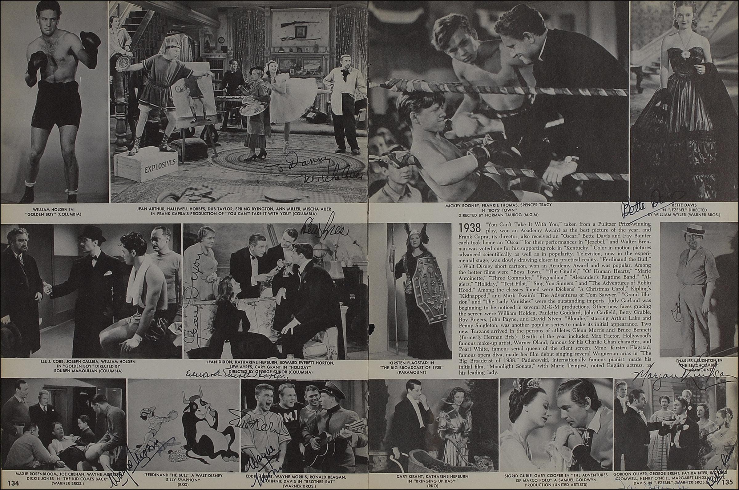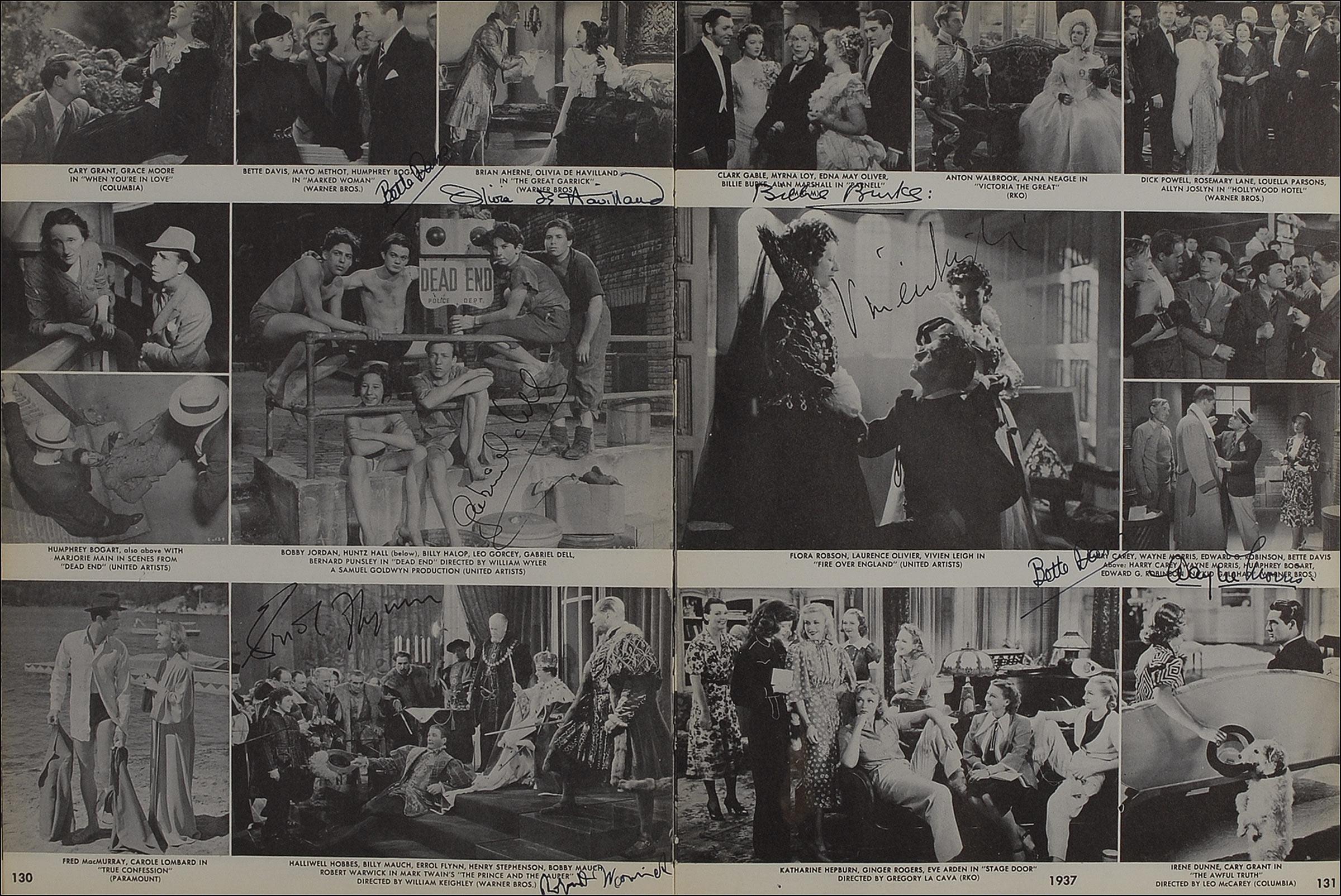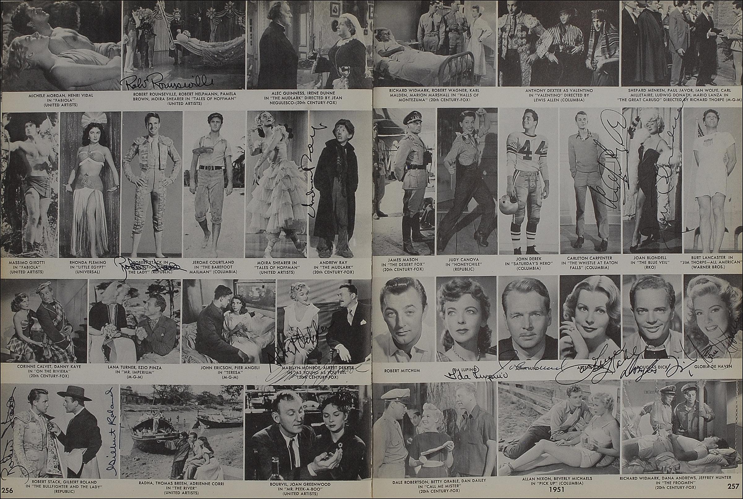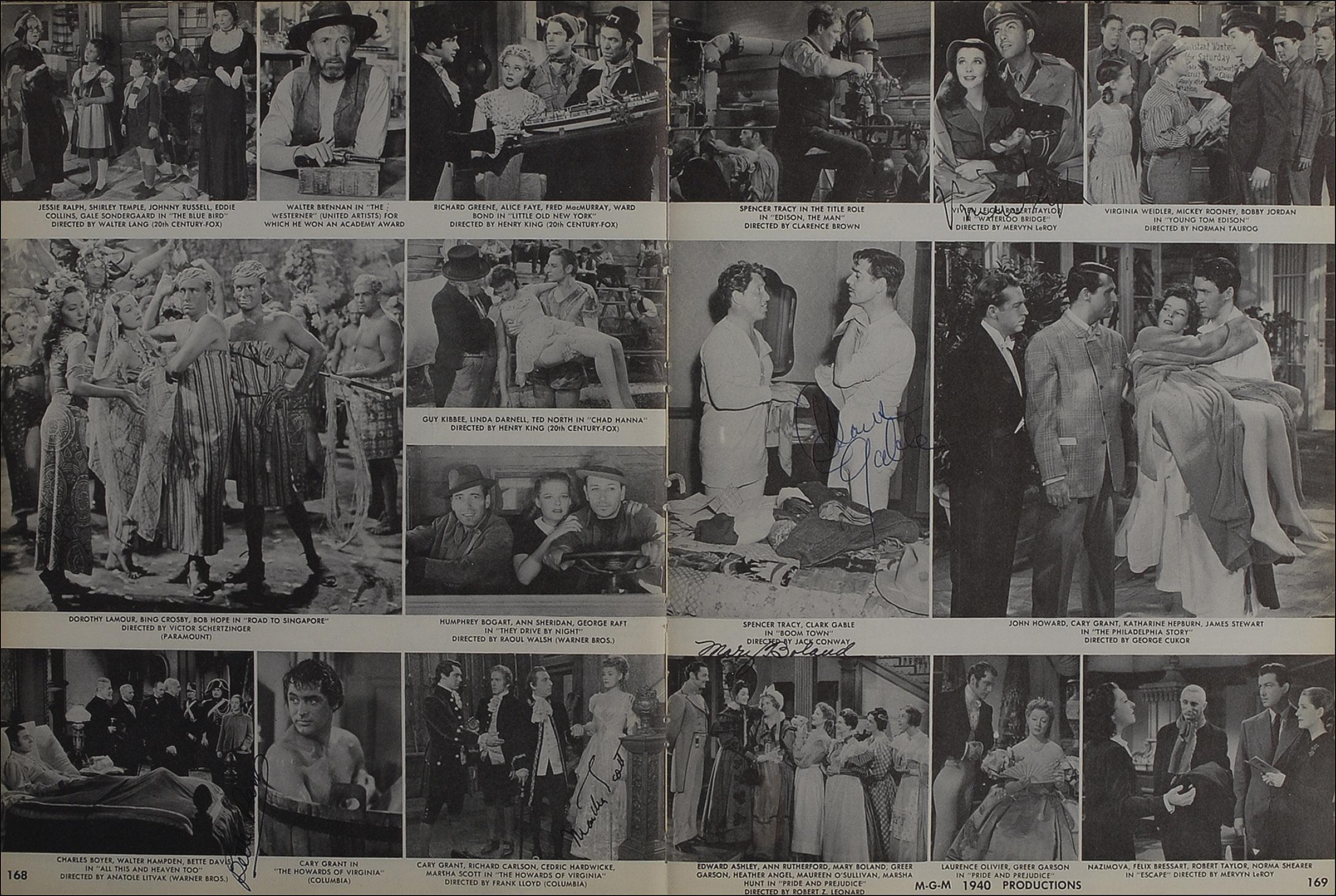 A magnificent vintage autograph collection of over 1000 signatures contained in the hardcover book titled A Pictoral History of the Talkies by Daniel Blum. NY: G. P. Putnam’s Sons, 1958. Hardcover, 9.25 x 12.25, 318 pages. Book is signed on the opening pages and inside in fountain pen and ink by 313 actors and actresses, with a total of 1001. Most have signed by their photos contained inside the pages, some even inscribing to the book’s owner, with the first free end page and title page bearing multiple signatures, and the reverse of the first free end page bearing the signatures of Marilyn Monroe, Clark Gable, and Vivien Leigh all in the upper right. Highlights in this collection include five Marilyn Monroe signatures, six Clark Gables, six Vivien Leighs, five Harpo Marxs, seven Errol Flynns, three Betty Grables, and an amazing 30 Bette Davis signatures.