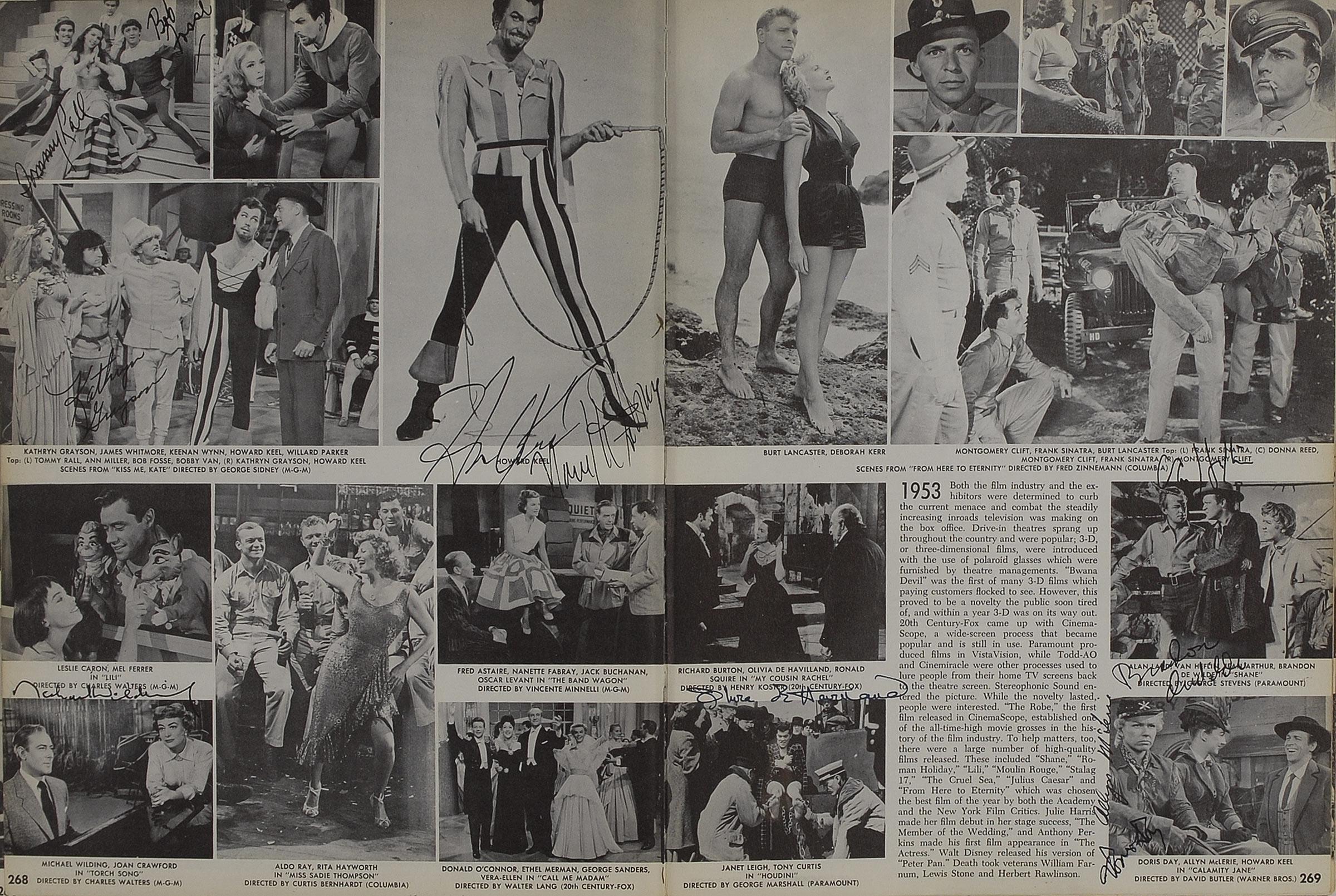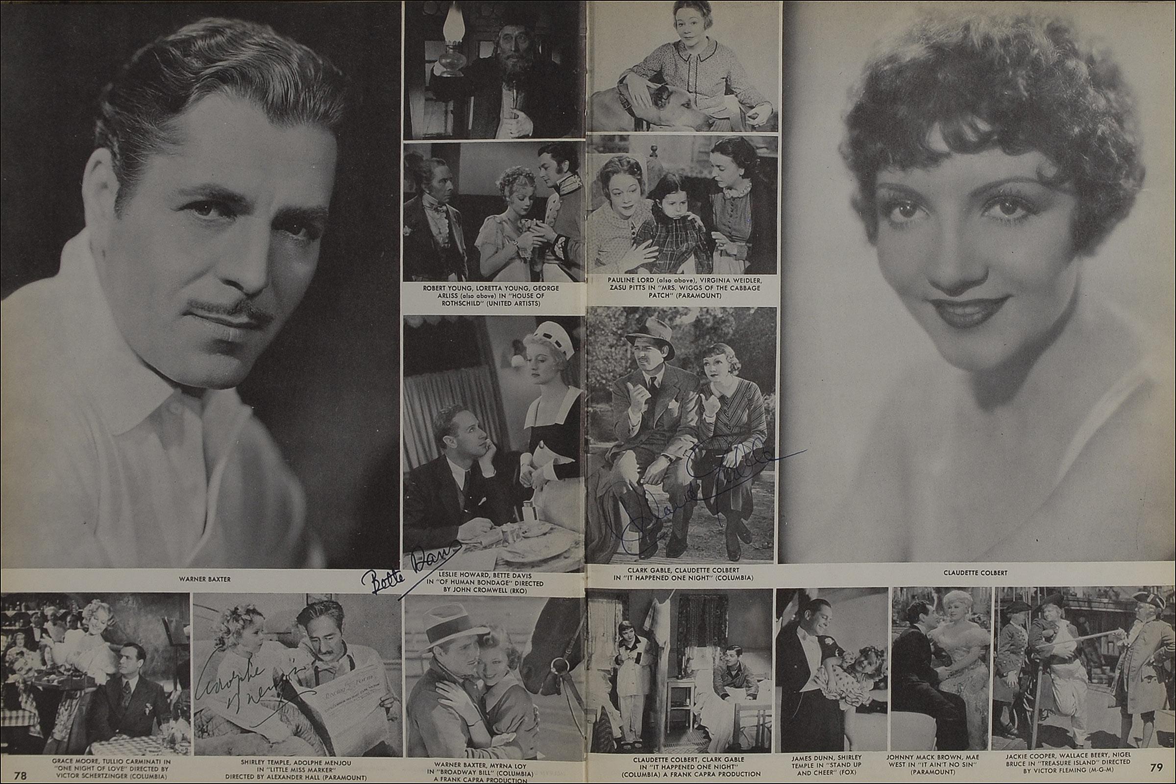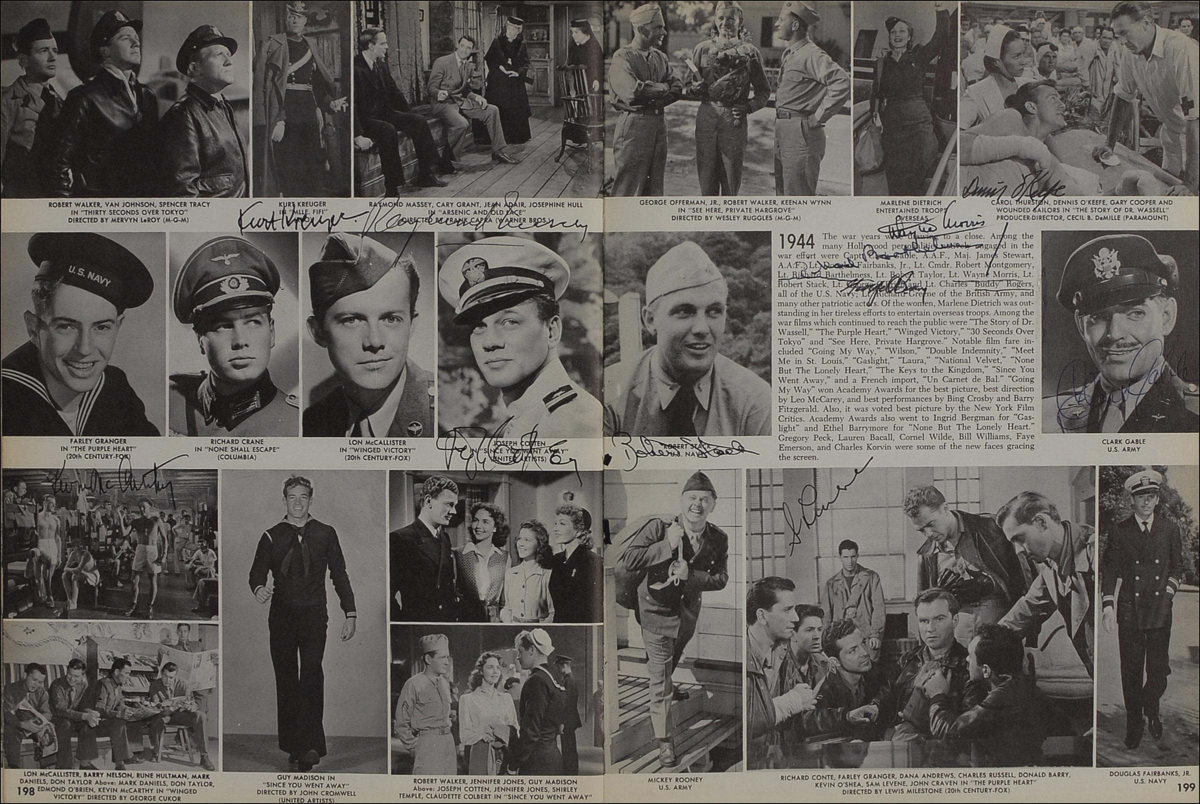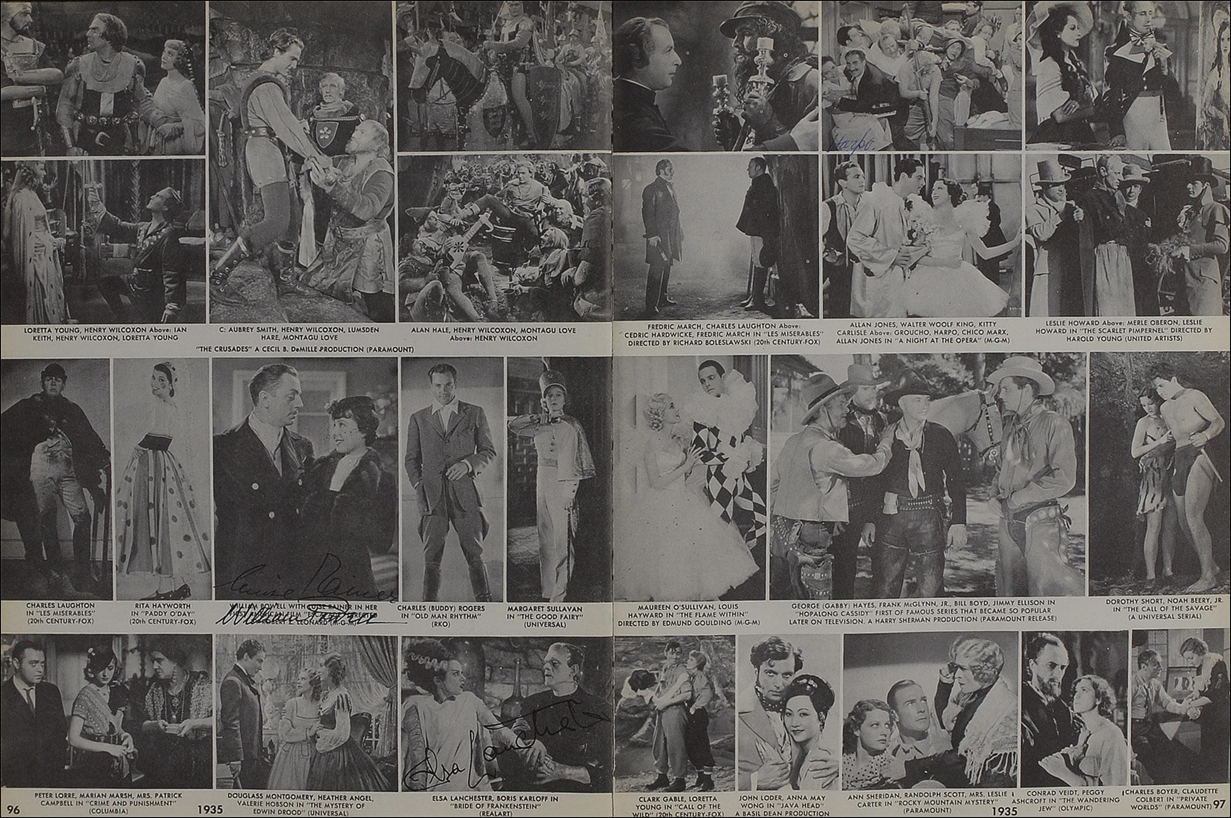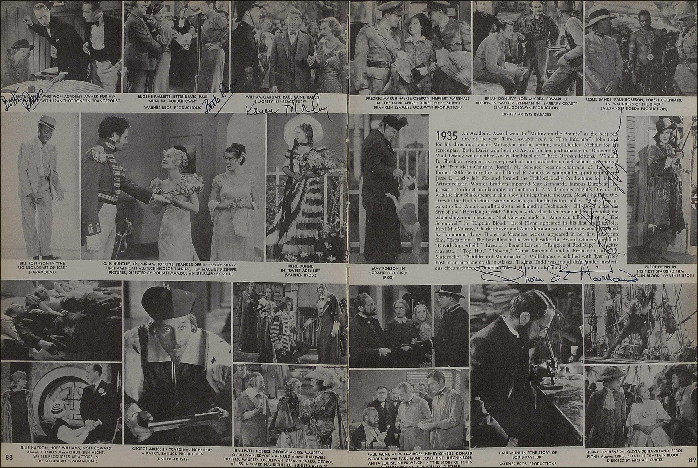 A magnificent vintage autograph collection of over 1000 signatures contained in the hardcover book titled A Pictoral History of the Talkies by Daniel Blum. NY: G. P. Putnam’s Sons, 1958. Hardcover, 9.25 x 12.25, 318 pages. Book is signed on the opening pages and inside in fountain pen and ink by 313 actors and actresses, with a total of 1001. Most have signed by their photos contained inside the pages, some even inscribing to the book’s owner, with the first free end page and title page bearing multiple signatures, and the reverse of the first free end page bearing the signatures of Marilyn Monroe, Clark Gable, and Vivien Leigh all in the upper right. Highlights in this collection include five Marilyn Monroe signatures, six Clark Gables, six Vivien Leighs, five Harpo Marxs, seven Errol Flynns, three Betty Grables, and an amazing 30 Bette Davis signatures.