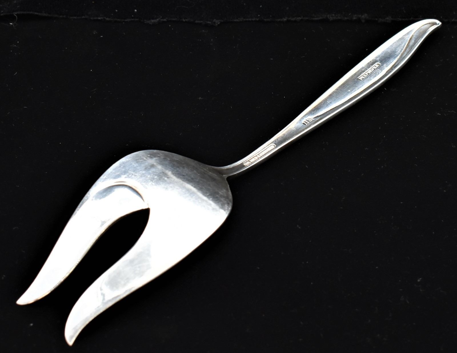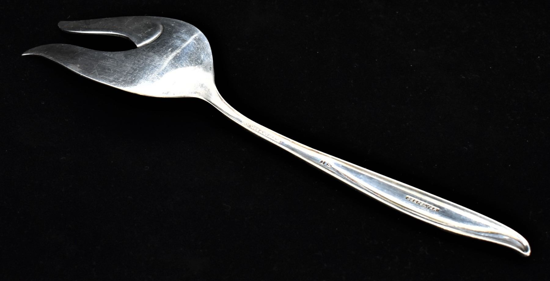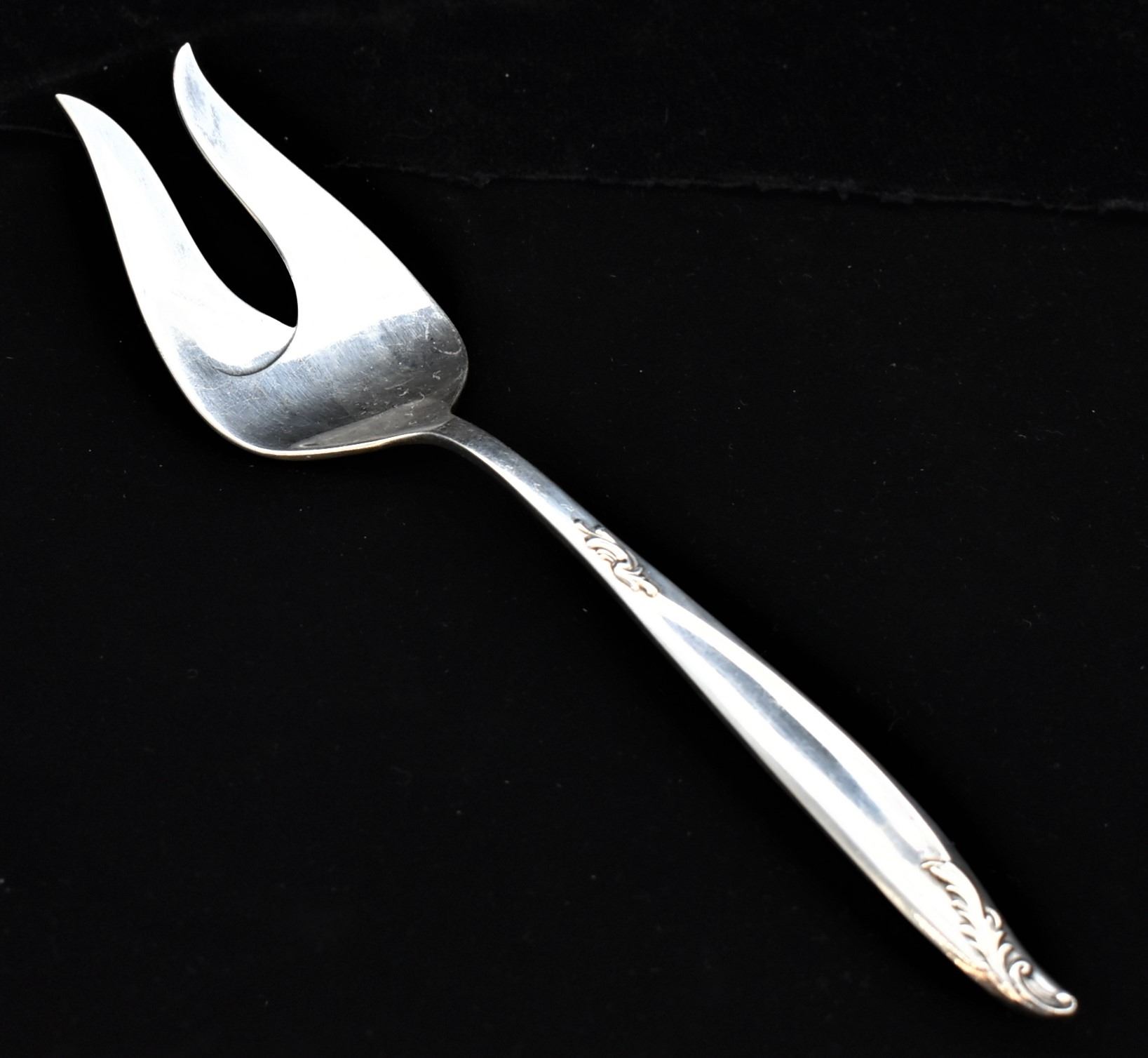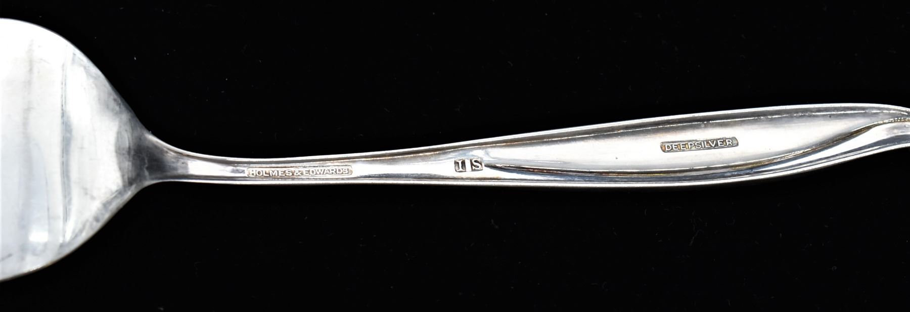 Vintage Estate Holmes & Edwards Silver Plate Woodsong Salad Serving Fork, measures 9.25''L x 2''W and is marked on the back of the handle, Deep Silver