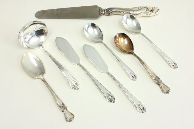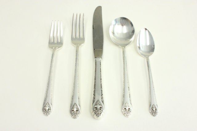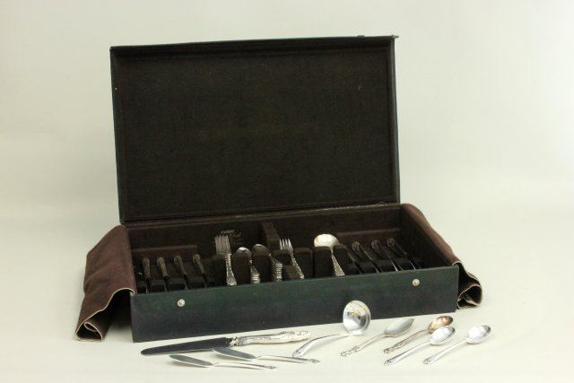 In case. Including: 16 knives,16 luncheon forks, 16 dinner forks, 16 soup spoons, 32 teaspoons, 1 ladle, 1 cheese spreader, 2 sugar spoons, 2 butter knives. Approx. 102 pieces total. Good condition.