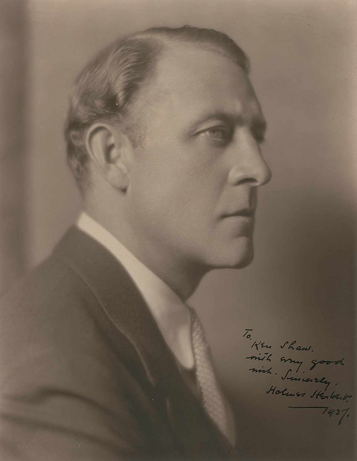 Vintage matte-finish 7.25 x 9.5 photo of Herbert in near-profile by Nickolas Murray of New York, signed and inscribed in fountain pen, "To Ken Shaw, with every good wish. Sincerely, Holmes Herbert, 1927.” Blindstamped in the lower left corner by Nickolas Murray, with his ink credit stamp on the reverse. In fine condition, with evenly trimmed edges. Herberts' autograph is extraordinary rare in any form—this representing the first we have ever offered.