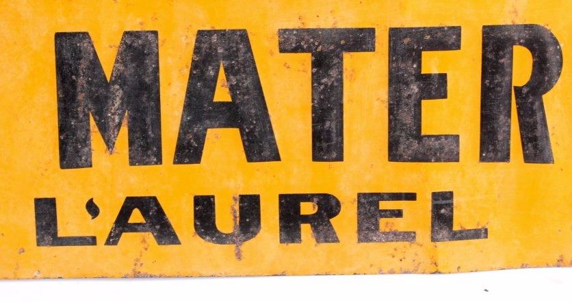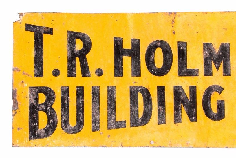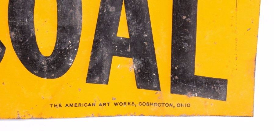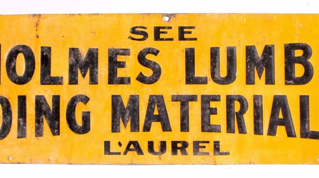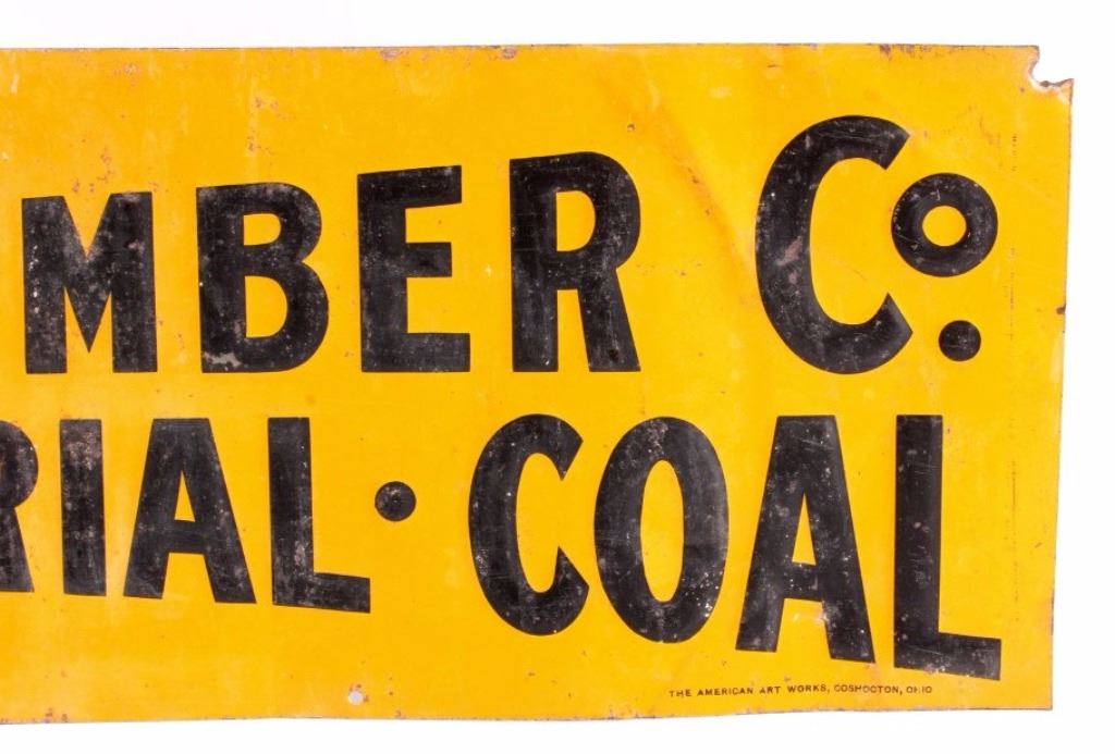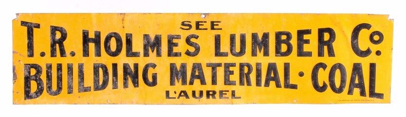 This is an original advertising sign from Laurel, Montana. The sign reads "See T.R. Holmes Lumber Co. Building Material Coal Laurel". The sign is also marked in the lower right corner "The American Art Works, Coshocton, Ohio". This is an early embossed tin sign. It shows good overall condition with wear as shown. The sign measures 6" x 24".