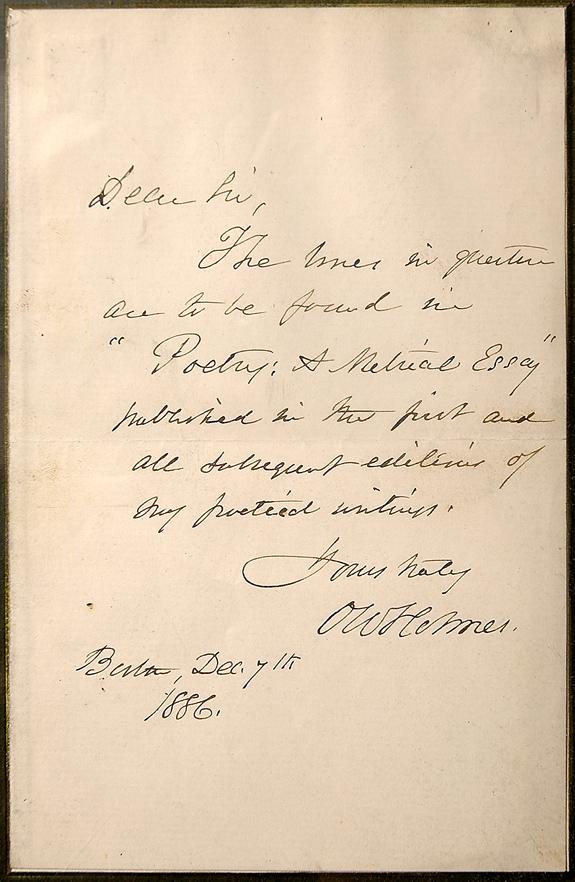 Holmes, Oliver Wendell, Sr. - ALS (1809-1894) Physician and writer; one of the most popular American poets of the 19th century. Autograph letter signed ("O W Holmes"), 1p, 7 x, Boston, Dec. 7, 1886. To an unnamed man, explaining, "The lines in question are to be found in 'Poetry: A Metrical Essay' published in the first and all subsequent editions of my poetical writings." Fine. Matted with a portrait of Holmes and framed to an overall size of 13½ x 16½ in.