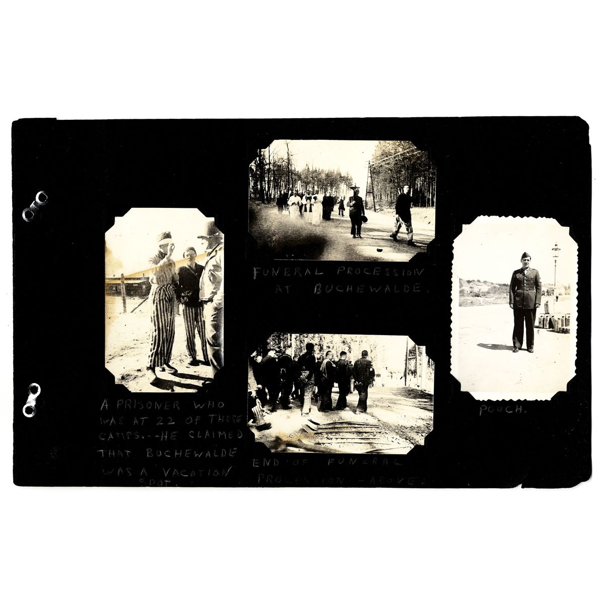 Haunting photo album from the Nazi concentration camp, Buchenwald. Album includes 11 graphic photos in total with a few of the haunting captions reading: ''Unloading bodies from Buchenwalde…Pile of dead at Buchenwalde camp…'' Album on black construction paper with captions in white ink measures 10.5'' x 7''. Photos measure 2.25'' x 3.5'' and contain minor foxing and toning, but the images are still vivid. An extraordinary collection of Holocaust photos.