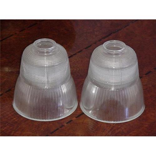 A pair of holophane glass shades, 6 1/2" tall, 6 1/2" in diameter with a 2 1/4" fitter. The shades are in very good condition, they are marked Holophane no. 2070. A beautiful pair of prismatic glass shades of large size, they will be beautiful hanging over a kitchen work space and look at home in an antique setting or a modern one. (6)
