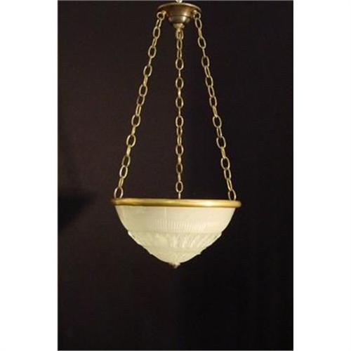 </font></strong>Circa 1920 Holophane glass lens framed in aged brass rim suspended on tree chain and conapy .Dimension height 30 " diameter 14 1/2".</font>