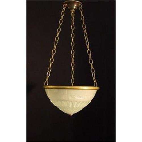 circa 1920 a inverted dome holophane glass chandelier with brass harware.Dimension height 30" diameter 14".