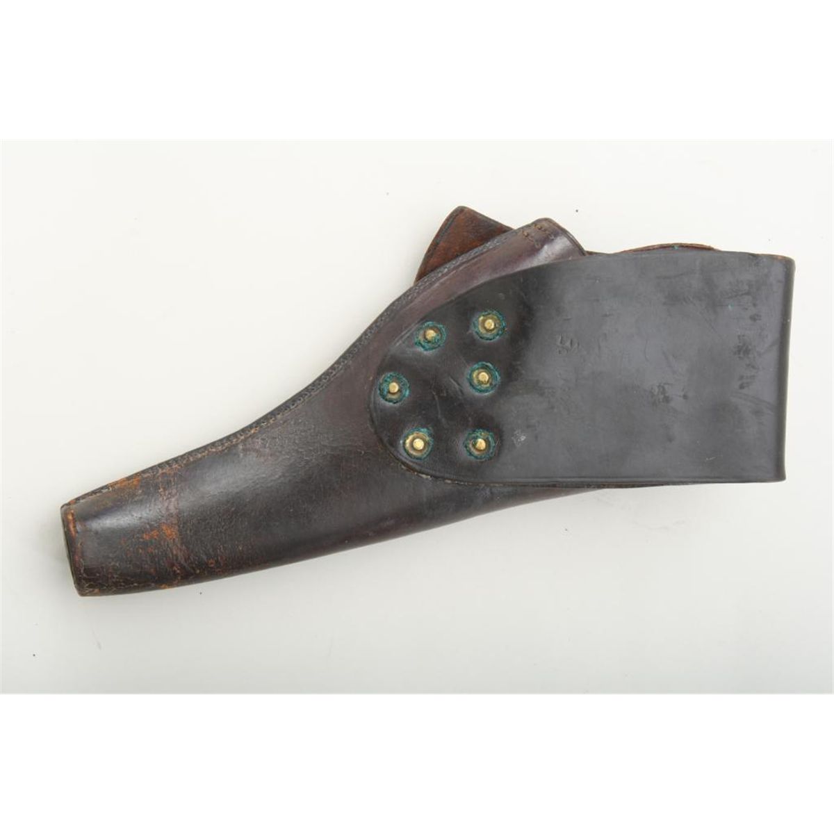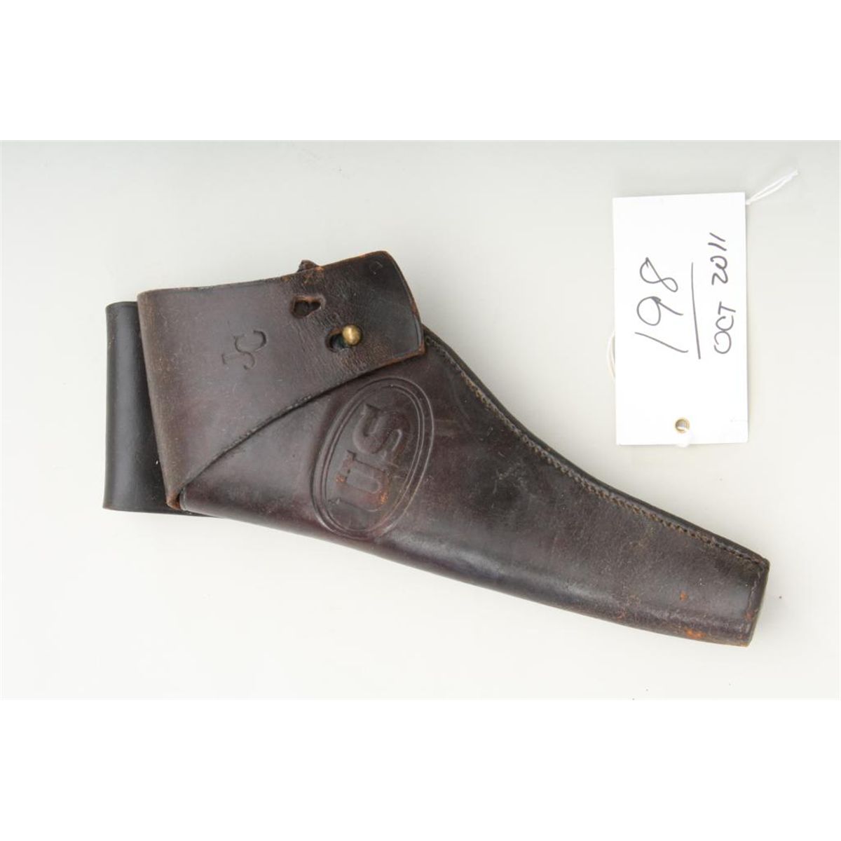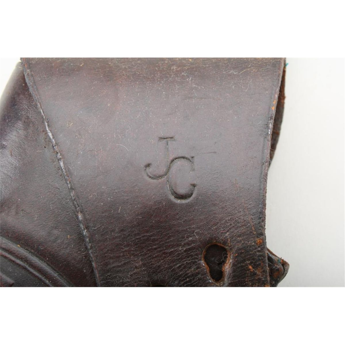 Holster for 5-1/2” barrel Colt Single Action Army revolver, US military issue, brown leather, two-position flap, by Lanz Owen & Co. Chicago. Six rivets on belt loop. Very good plus condition, just some very slightcracking and crazing. Stitches and plug intact. Flap soldier carved with initials “JC”. Belt loop attachment fully intact. Flap is marked “D” in corner. An exceptional example. Est: $500 - $1,000