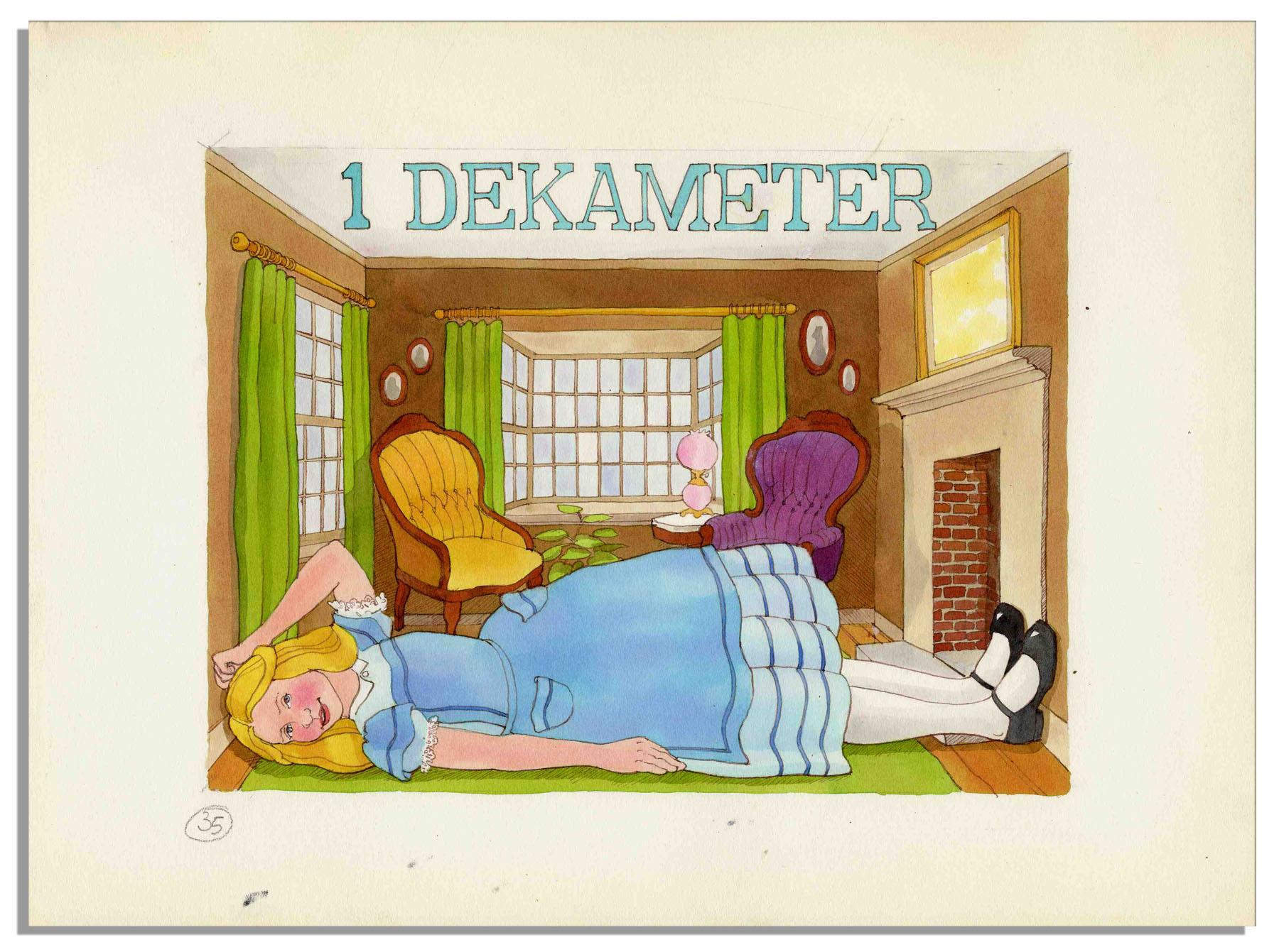 Colorful watercolor from the ''Holt Metric Filmstrips: The Further Adventures of Alice & Meter Rabbit'' series, copyright 1978. Holt Metric Filmstrips were developed as a classroom teaching tool for students, combining cassettes and filmstrips. Painting depicts an overgrown Alice lying across the floor of a house with ''1 Dekameter'' written across the top in teal watercolor as her official measurement. Painting, numbered ''35'' in pencil, measures 11.5'' x 9''. Two minor ink smudges on the white border, else fine condition.