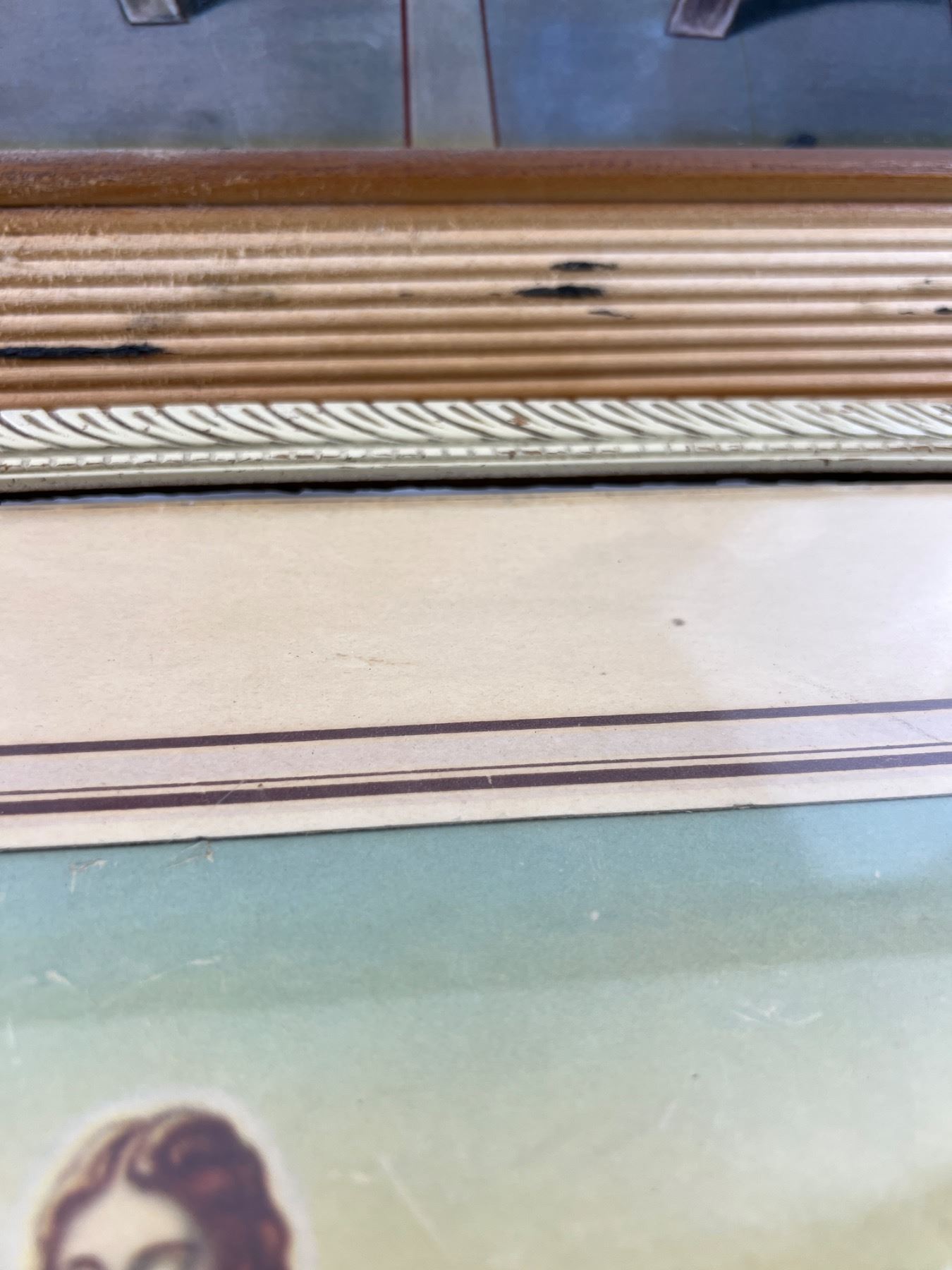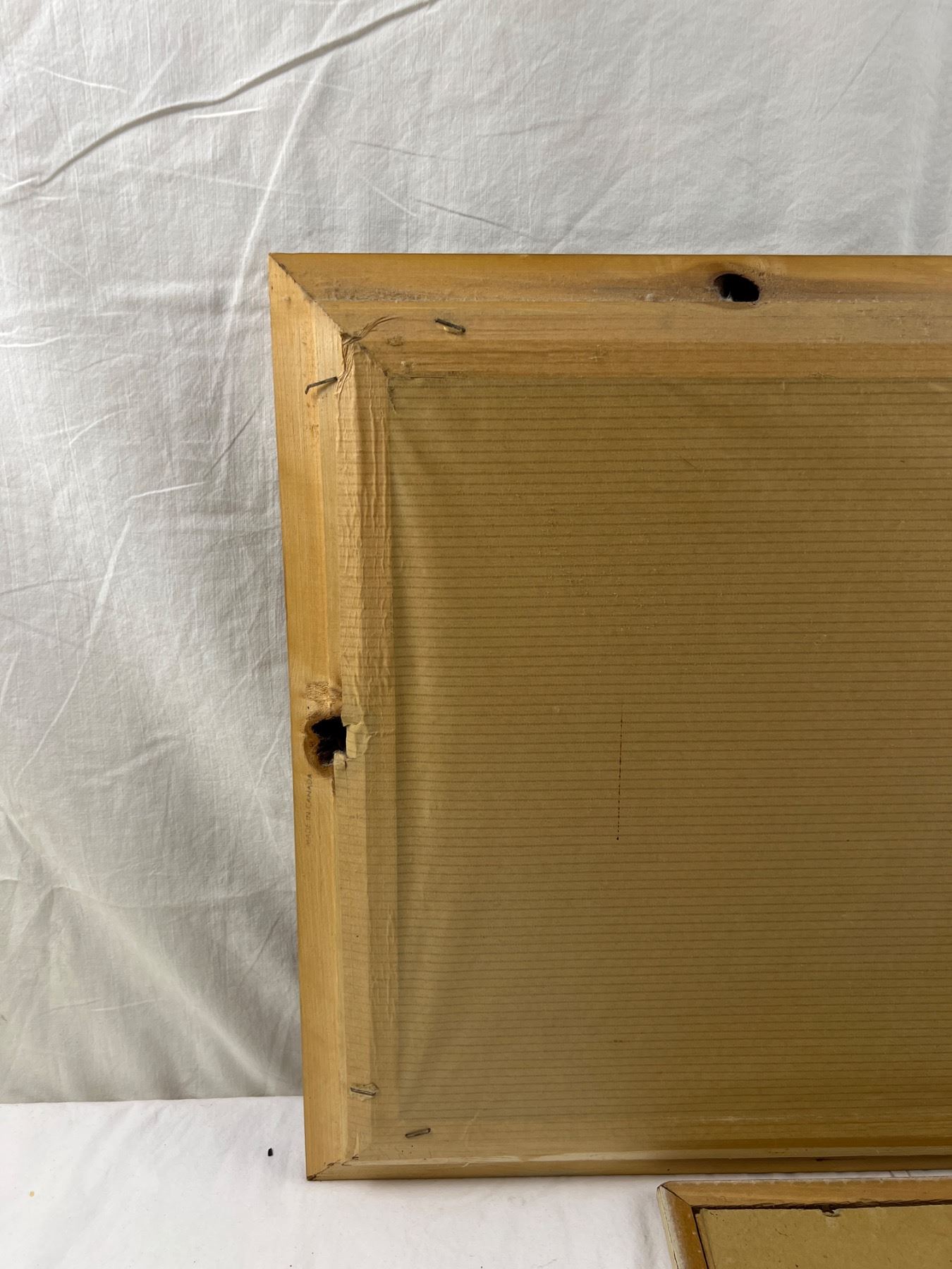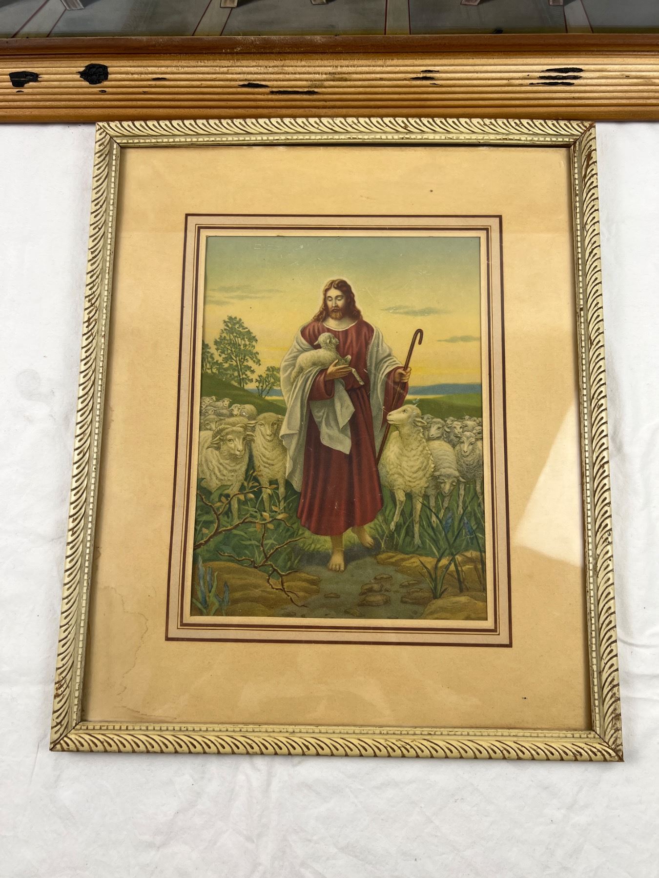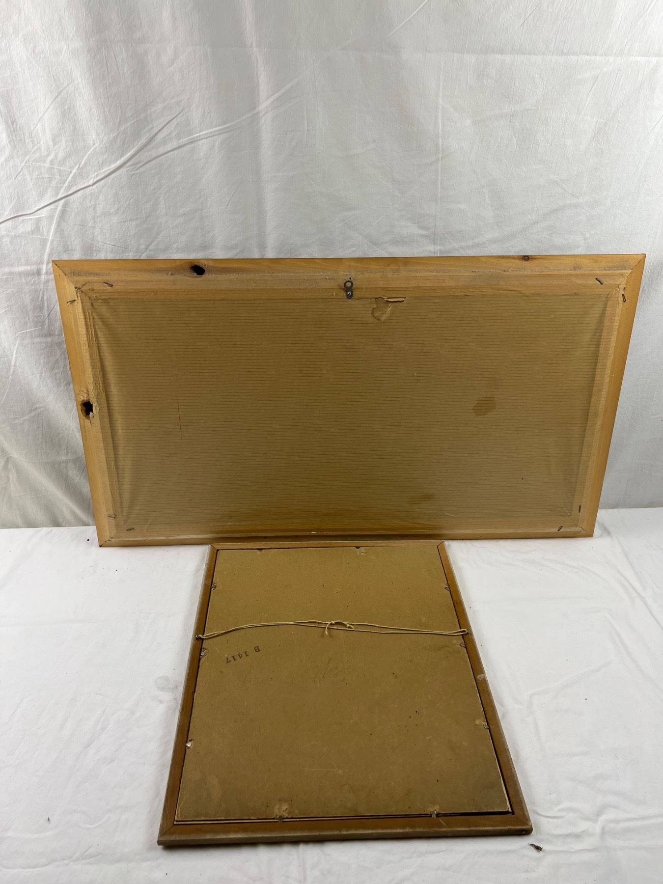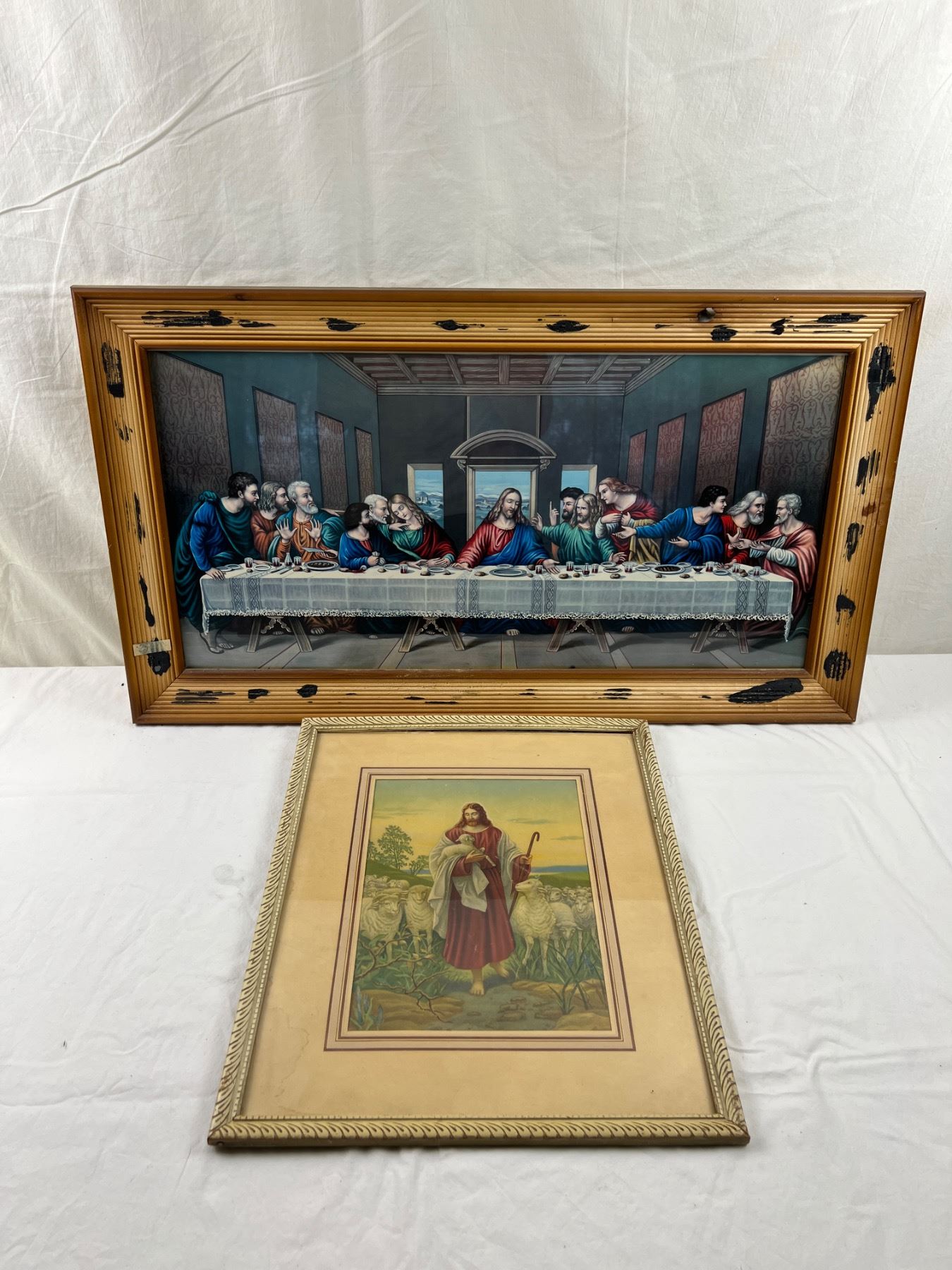 Last Supper print measures 32" by 18". Has some kind of dried adhesive on the front. Smaller artwork has slight separation of frame and glass.