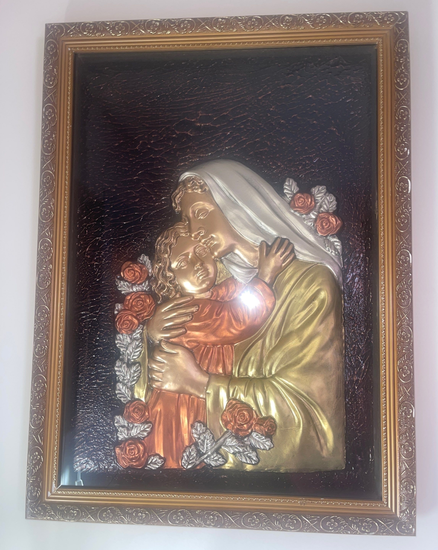 Holy Mother & Child Metallic Textured Shadow Box Art 19x24
